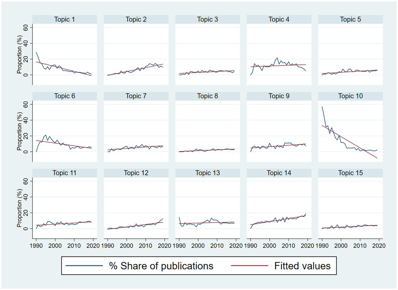 We also calculate the volume and share of publications per topic per year. A linear regression model was conducted to detect the trend of each research topic in different time periods (1990–2000, 2001–2010, and 2011–2019), with the share of publication as an outcome variable, and the number of years as a predictor variable. “Hot’ topic was defined when the coefficient was significantly positive, and the “cold” topic was detected when the coefficient was significantly negative. Statistical significance was identified if the value of p was less than 0.05.