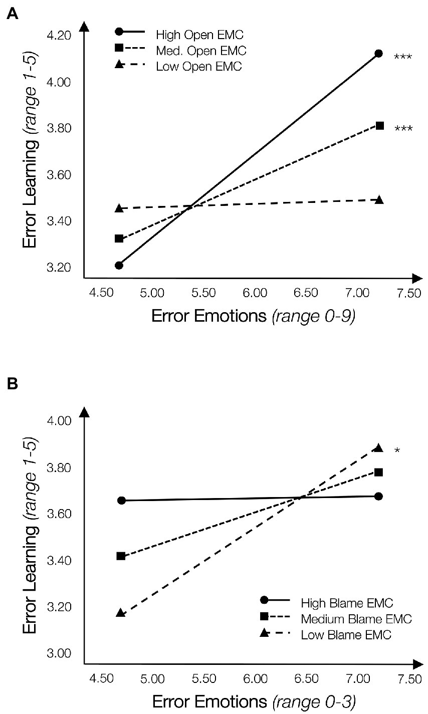 Our results show that open EMC perceptions mitigate the negative relationship between negative emotions and error learning, as well as the negative relationship between time pressure and error learning. While we expected that blame EMC perceptions would exacerbate the negative relationship between negative emotions and error learning, we find a mitigating effect of low blame EMC perceptions. Further, and contrary to our expectations, we find that blame EMC perceptions mitigate the negative relationship between small error consequences and error learning, so that overall, more error learning takes place regardless of consequences when participants experience a blame EMC. Post-hoc analyses reveal that there is in fact an inverted- U-shaped relationship between time pressure and error learning.