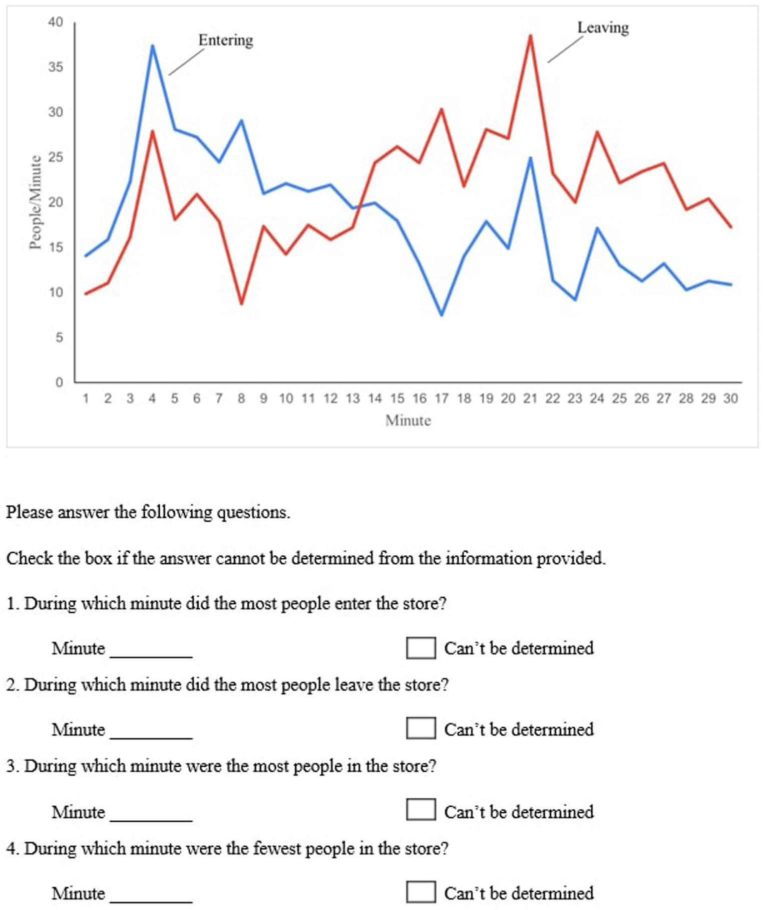 Task 2 was an extension of the department store task presented in task 1. Task 2 consisted of eight questions relating to typical stock-flow problems’ (refer to Figure 2; Cronin et al., 2009). All questions aimed to examine the subject’s comprehension, familiarity with accumulation, and level of correlation heuristic assumption. Similar to task 1, task 2 gave participants a graph showing how many people entered and left a room every minute over a 30-min period (Cronin et al., 2009). However, unlike task 1, in task 2, as per the graph provided, subjects were instructed to draw the number of people present in the store over a 30-min interval on a blank chart placed underneath the flow graph. The sketching of the stock over a 30-min interval helped study whether the participants relied on the usage of the correlation heuristic while trying the stock-flow problems. Participants had to start from the black dot on the y-axis of the blank stock graph and sketch the trajectory of the number of people in the store over time. The point for initiating the graph drawing was placed midpoint on the vertical axis to avoid potential biases.