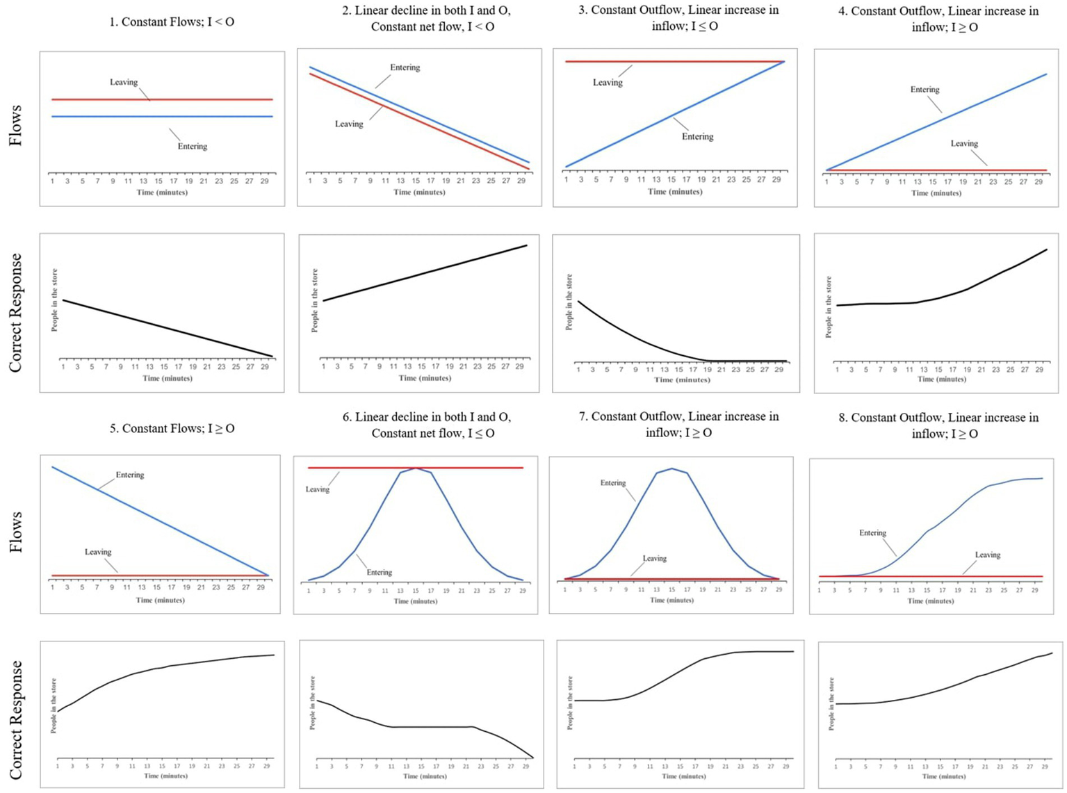 Figure 2. The eight stock-and-flow questions given in task 2 and the corresponding correct responses.