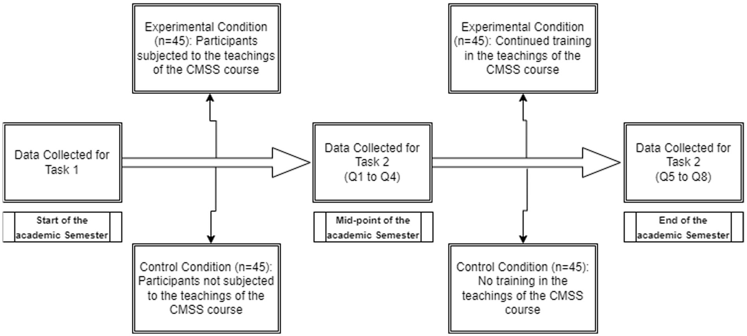 The data for task 2 was collected in two halves. The data for Q1 to Q4 was gathered during the mid-semester point, i.e., the first week of April 2019. By the mid-term of the semester, the course instructor had finished concepts up to Module 3 (as shown in Appendix). The data for Q5 to Q8 was collected at the endpoint of the semester, i.e., the second week of June 2019. By the semester’s end, the course instructor had finished all six modules (as shown in the Appendix). Task 2 helped in studying the effectiveness of the CMSS course in increasing the participant’s ability to solve stock-flow problems. For each half of task 2 (comprising of four questions), participants were asked to answer the four questions within 30-min. The control condition participants who were not provided any of the CMSS course training were also given the same amount of time for both halves of task 2.