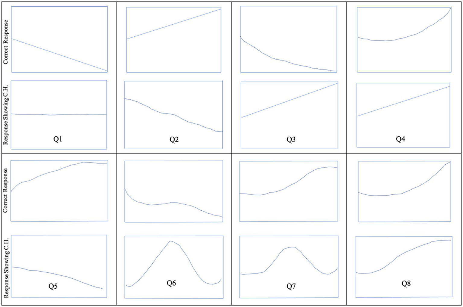Moreover, for the relatively harder questions (Q6-Q8), participants in both experimental and control conditions majorly relied on the correlation heuristic when responding to the questions incorrectly. Therefore, resulting in an identical proportion of participants in both the conditions using the correlation heuristic while answering the questions incorrectly. Thus, lack of attention and the difficulty level of questions may have led to a statistically similar proportion of the correlation heuristic reliance on the control and experimental condition’s wrong responses.