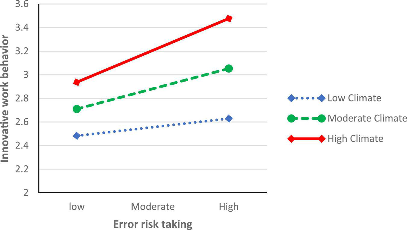Furthermore, we expect that the indirect relationship between perceived psychological safety and IWB via error risk taking is moderated by perceived organizational innovation climate. Compared with low innovation climate, high innovation climate further reduces the perceived risks and uncertainties (e.g., Parzefall et al., 2008; Afsar and Umrani, 2020) that psychologically safe employees experience when they convert what they have learned from error risk taking to IWB. Accordingly, we hypothesize as follows: