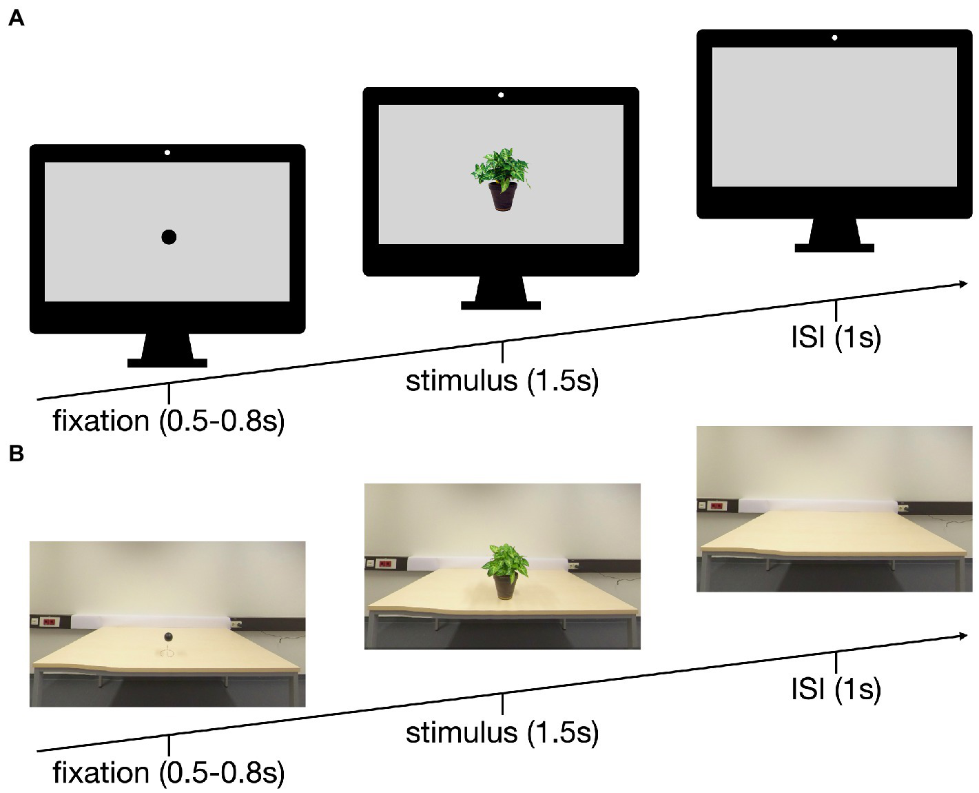 Setup of the trials in the PC (A) and the VR (B) conditions: 0.5–0.8 s fixation, 1.5 s stimulus, 1 s inter stimulus interval (ISI).
