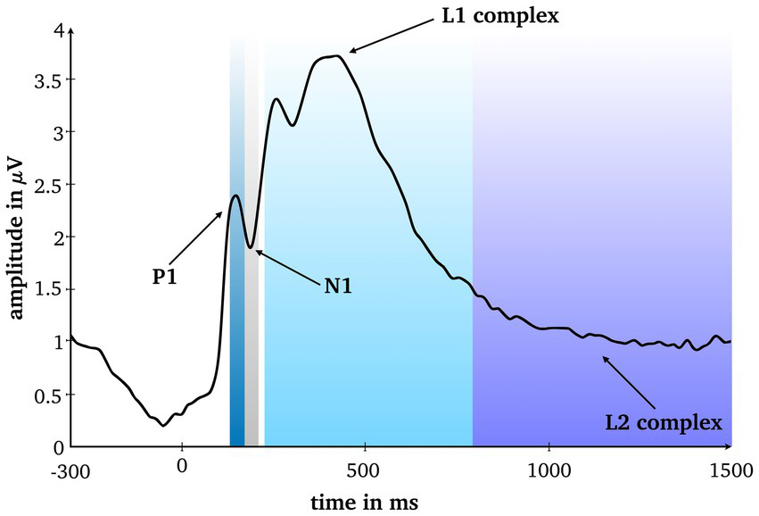 The EEG data were preprocessed and analyzed with in-house Matlab-scripts implementing methods from EEGLAB v2021.1 (Delorme and Makeig, 2004). To this end, the data was referenced to average reference for further processing and filtered with an FIR band pass filter between 0.25 and 30 Hz. Flat (5 s no signal) and noisy channels (> four standard deviations for high-frequency noise) were removed and subsequently interpolated and detrended. Removal of artifacts (eye, muscle, heart, other noise) was conducted on basis of an ICA using the ICLabel function from EEGLAB. Stimuli-locked epochs had a duration of 500 ms before onset and 1,500 ms after onset. A baseline 300 ms before stimulus onset was subtracted before the grand averages were calculated. No trials were rejected from the reported results.