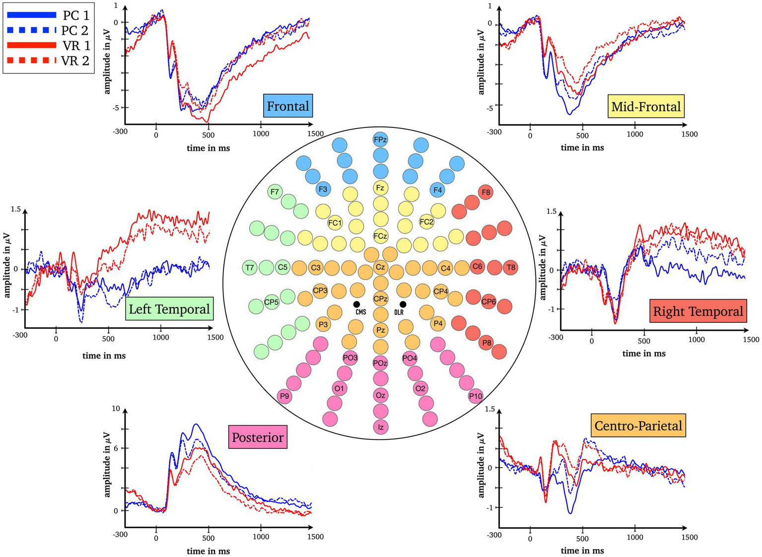 The statistical analysis was conducted in SPSS (Version 27). For each time window, a 2 × 2 × 6 repeated measurement ANOVA with factors Modality (VR, PC), Repetition (first presentation, second presentation) and Cluster (frontal, mid-frontal, left temporal, right temporal, posterior, centro-parietal) was calculated followed by corresponding post-hoc t-tests. For each time window, the post-hoc t-tests were calculated to compare the overall ERP amplitudes between the PC and VR conditions for each electrode cluster. For the time windows in which the RS effect occurred, the averaged amplitudes of the first and second presentation were compared for each electrode cluster. All reported ANOVA results are Greenhouse–Geisser corrected.