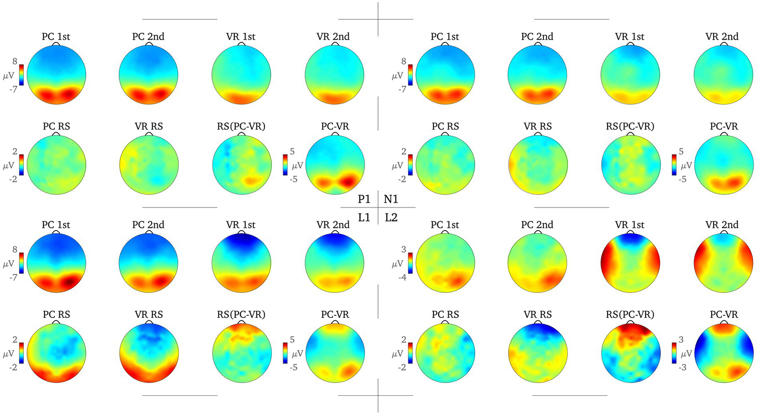 The RS effects for the PC and VR conditions in each time window were calculated by subtracting the ERP amplitudes at the second presentation from those at the first presentation.