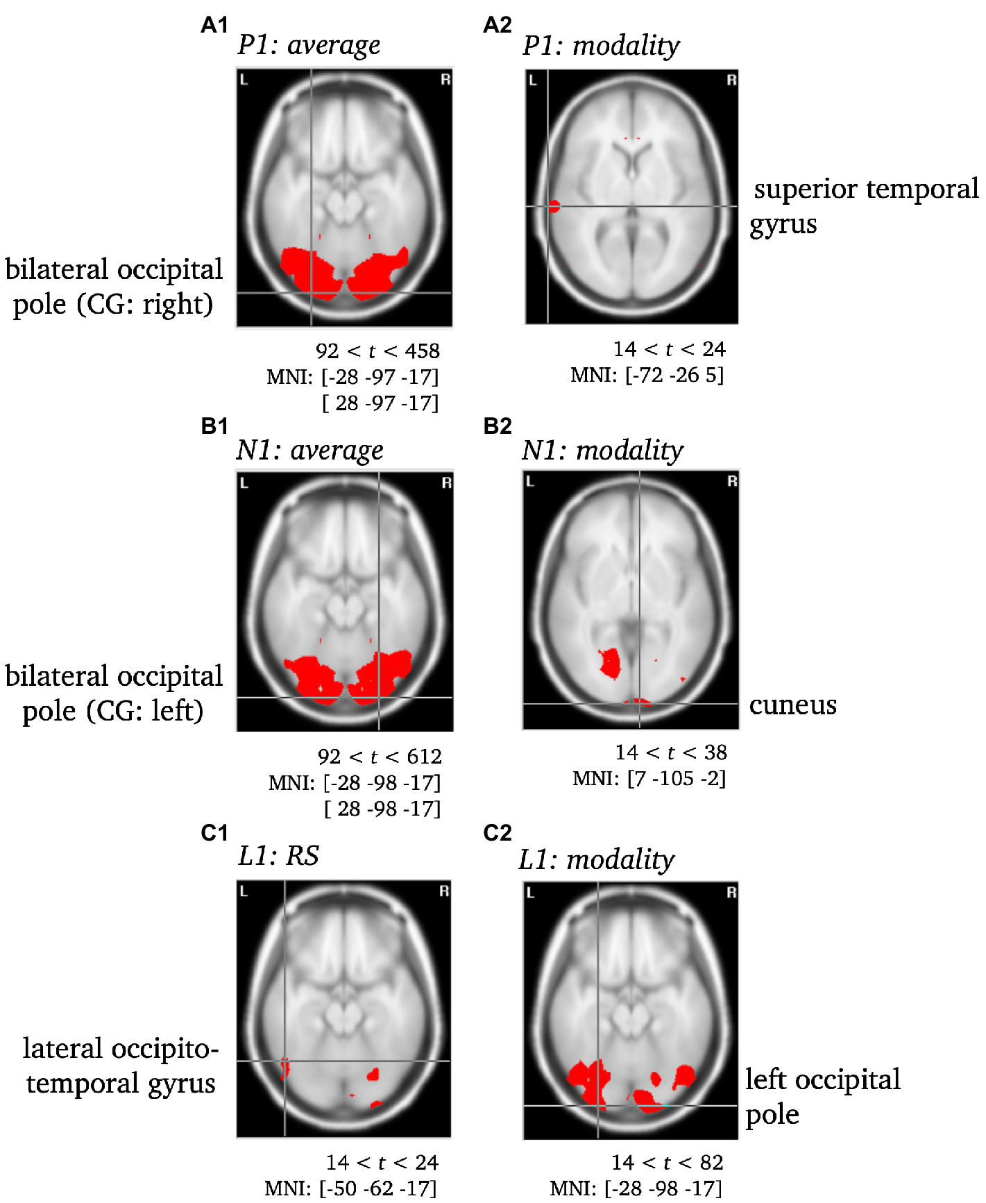 P1 & N1. Both components were localized to the bilateral occipital pole, with the center of gravity either in the left (P1) or the right (N1) hemisphere when averaged across conditions and were thus consistent with previous literature (see, e.g., Di Russo et al., 2002; Gruber et al., 2006b). Moreover, the modality effect was characterized by significantly different activity of the superior temporal gyrus accompanying the P1 component and of the cuneus accompanying the N1 component (see Supplementary Table S13; Figure 5).