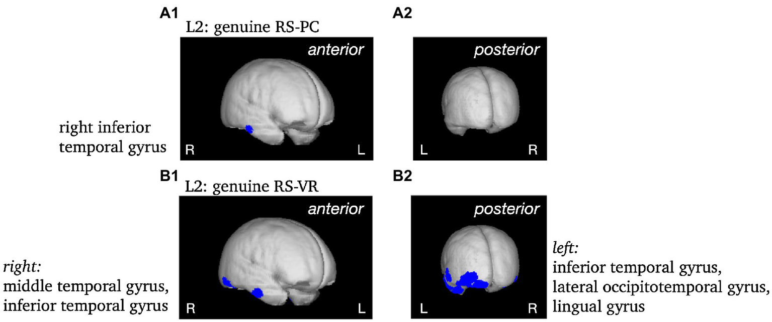 Non-statistical visualization of the genuine RS effect during L2 in the PC condition (panels A) and in the VR condition (panels B). MNI coordinates [x, y, z] for the respective brain regions as identified using the Neuronic Tomographic viewer: PC: right inferior temporal gyrus [57, −19, −24]; VR: right middle temporal gyrus [57,−11,−31], right inferior temporal gyrus [52, −63, −17], left inferior temporal gyrus [−43, −4, −39], left lateral occipitotemporal gyrus [−43, −84, −10], left lingual gyrus [−28, −84, −17].