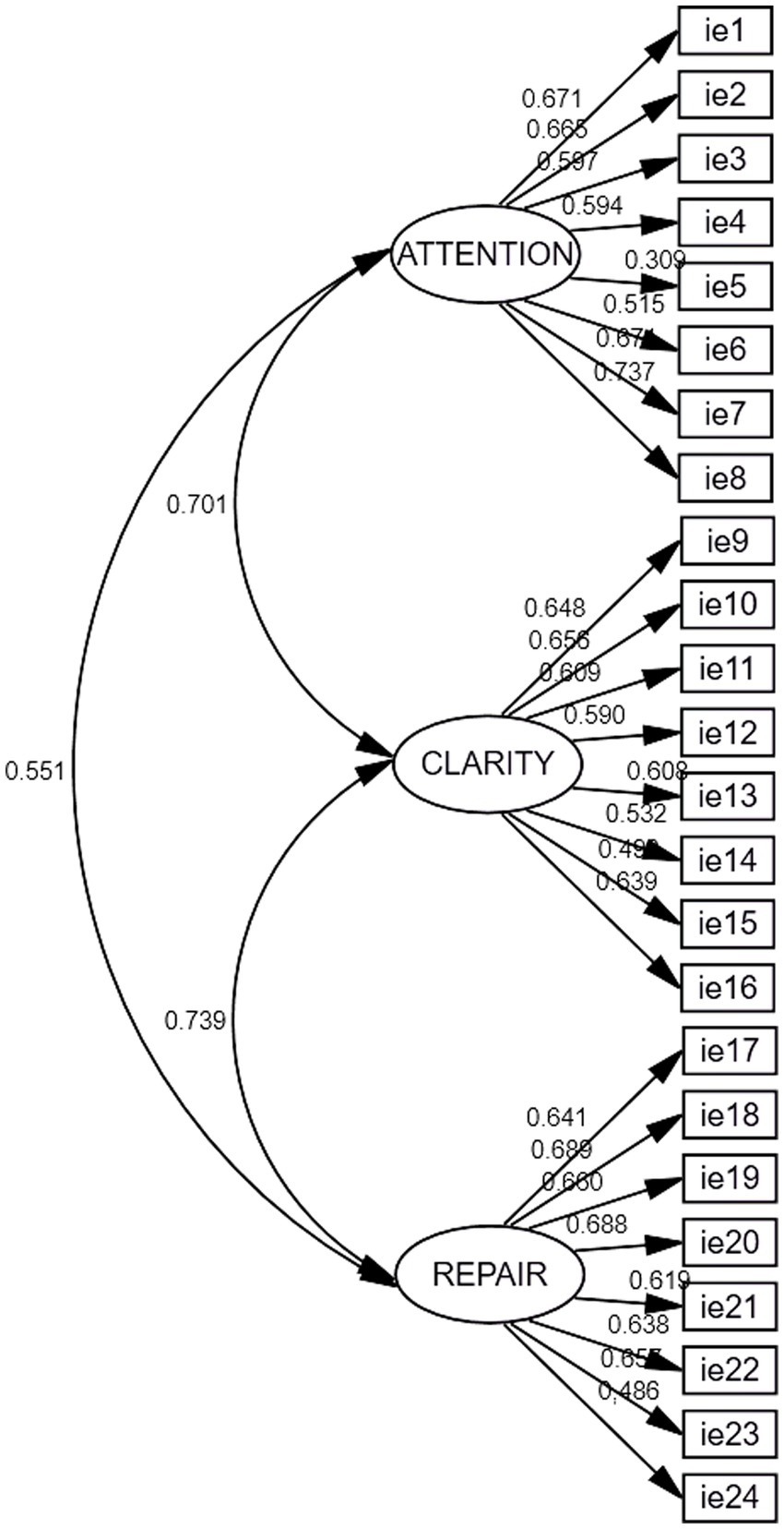 The distribution of responses for each item across the 5 points of the response scale was assessed. No “floor” or “ceiling” effects were identified. Means ranged from 2.56 (item 14) to 3.69 (item 4); standard deviations ranged from 1.18 (items 18 and 24) to 1.32 (item 5); asymmetry values were less than ± 1.00 (Hair et al., 2014). The values of McDonald’s omega estimator were 0.90 for the attention and clarity factors, and 0.92 for the repair factor. Cronbach’s alpha coefficients were 0.93 for the attention factor, 0.89 for the clarity factor, and 0.90 for the repair factor, with all items contributing to reliability.