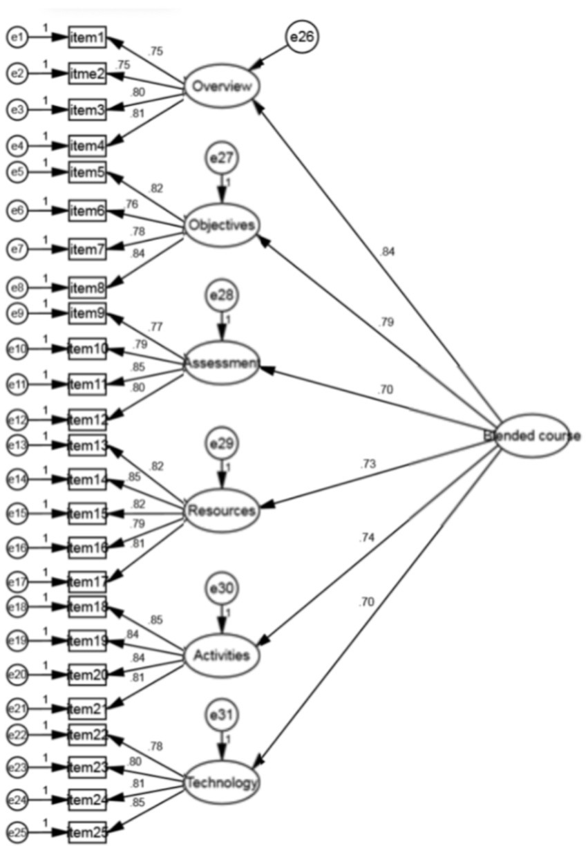 Finally, the EBLS that modified from Quality Matters Course Design Rubric Standards was determined as the initial scale that was preparing for the construct validity and reliability checks. The EBLS composed of six sub-scales (25 items in total): course overview (4 items), course objectives (4 items), assessments (4 items), course resources (5 items), in-class and online activities (4 items), and technology support (4 items). The measurement applied a 5-point Likert Scale (1-Strongly Disagree, 2-Disagree, 3-So-so, 4-Agree, and 5-Strongly Agree).