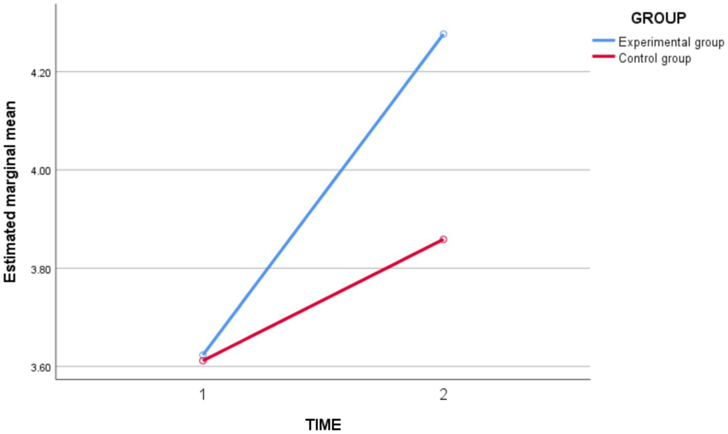 In terms of self-regulated learning ability (Figure 5), the results of the repeated measures ANOVA showed a highly significant time main effect [F(1,62) = 22.650, p = 0.000 < 0.05, partial η2 = 0.268], indicating a tendency toward the level of self-regulated learning ability to change into time. Time * Group interaction effect was highly significant [F(1,62) = 22.037, p = 0.000 < 0.05, partial η2 = 0.262], indicating that the experimental and control groups differed in the magnitude of change in the level of self-regulated learning ability before and after instruction. The between-group effect was significant [F(1,62) = 4.930, p = 0.030 < 0.05, partial η2 = 0.074], indicating that there was a significant difference in the level of independent learning between the experimental and control groups.