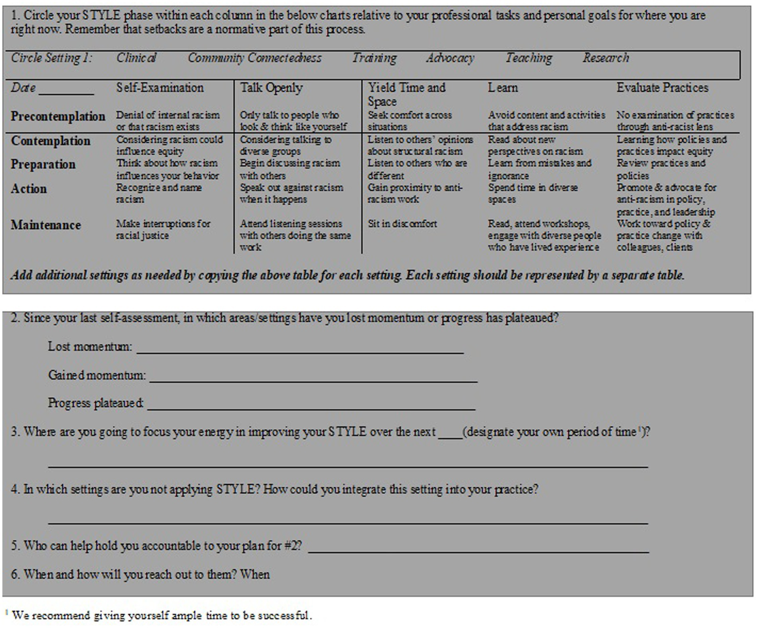 Figure 1 provides an accountability tool for implementing STYLE, using a cultural humility framework, as well as ways to maintain momentum in the ongoing process of developing STYLE. For each individual (and aspect of STYLE), commitment to implementation (i.e., precontemplation, contemplation, action, maintenance, termination; Prochaska, 2020) may differ. We strongly encourage the use of this monitoring form or a similar mechanism to track progress and setbacks in addition to having an accountability partner. Below we focus on how to implement each STYLE component with contextual examples focused on anti-Black racism within the legal system. Table 1 describe the STYLE application across six distinct yet overlapping contexts: advocacy and public policy, clinical care, community service, research, teaching, and training and supervision.