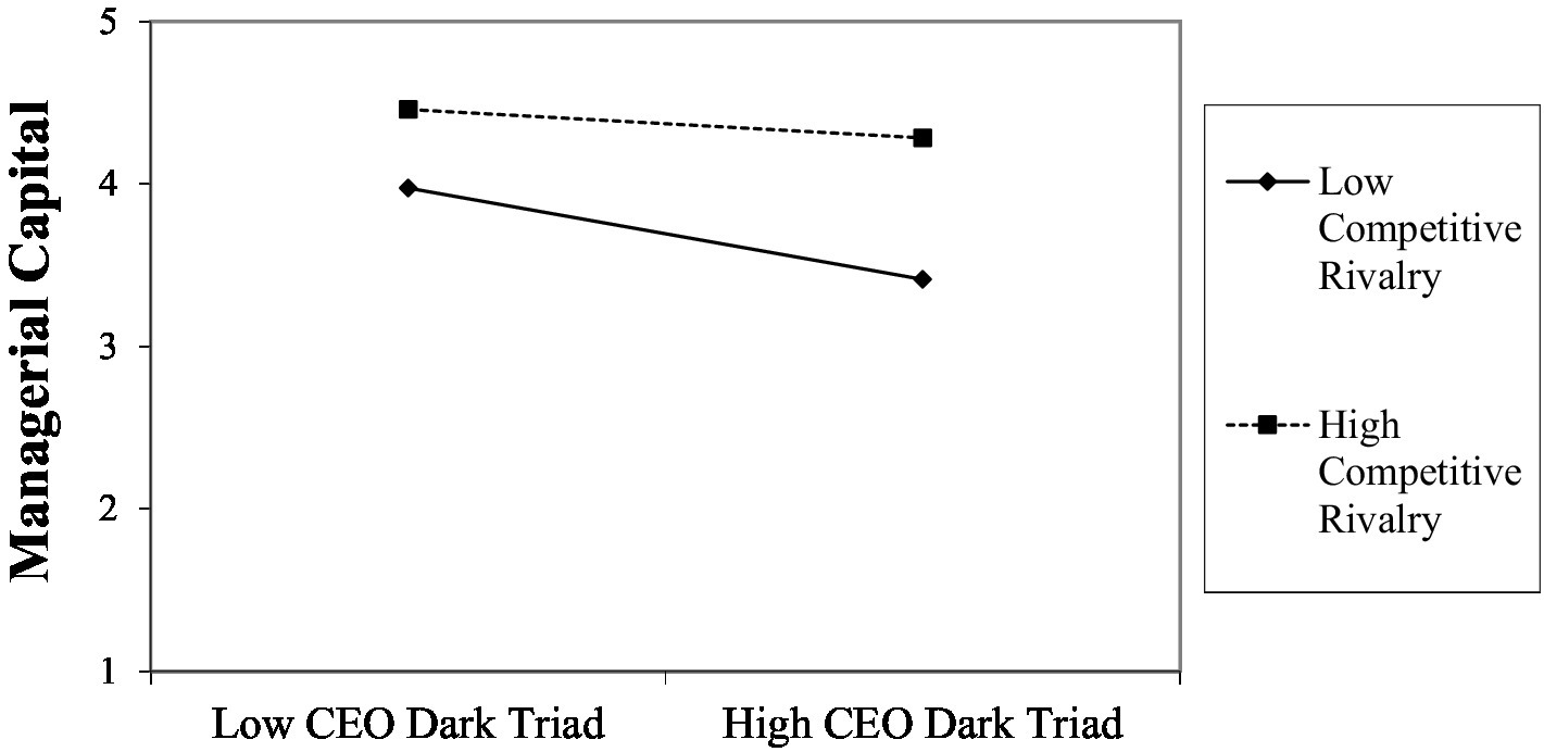 Hypothesis 7: Competitive rivalry will interact with the CEO’s dark triad in terms of (a) managerial capital, (b) breakthrough sales, and (c) organizational performance, leading to stronger beneficial effects and weaker detrimental effects.