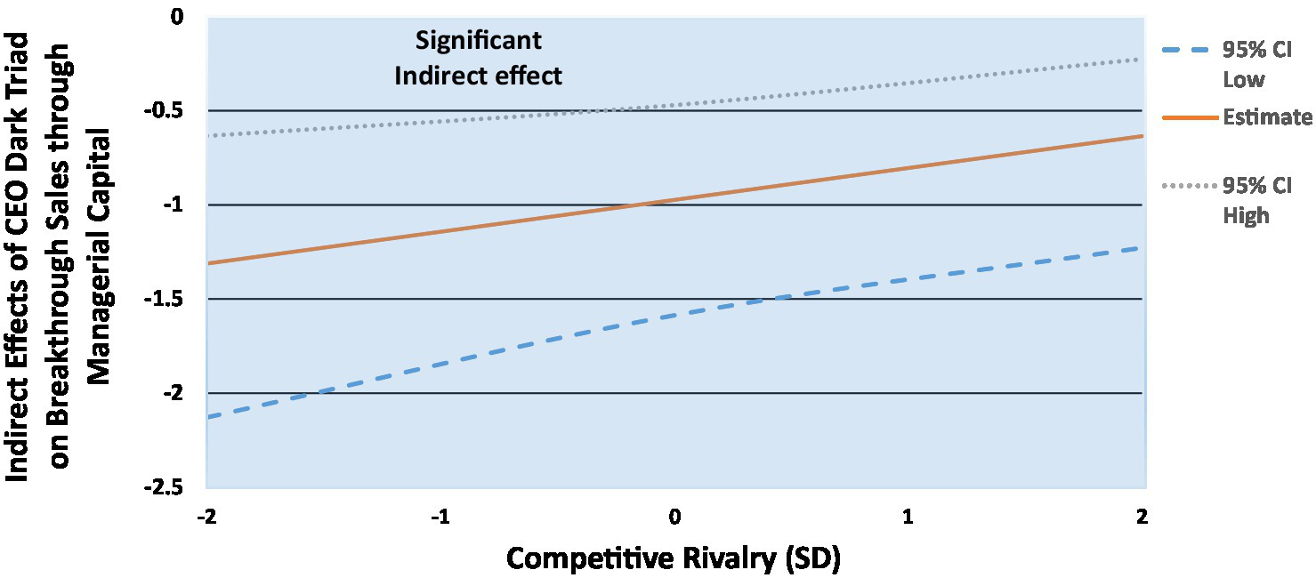 Hypothesis 8: The indirect relationship between the CEO dark triad and (a) breakthrough sales and (b) organizational performance, via managerial capital, will be moderated by competitive rivalry. The indirect effects become weaker as rivalry increases (moderated mediation).