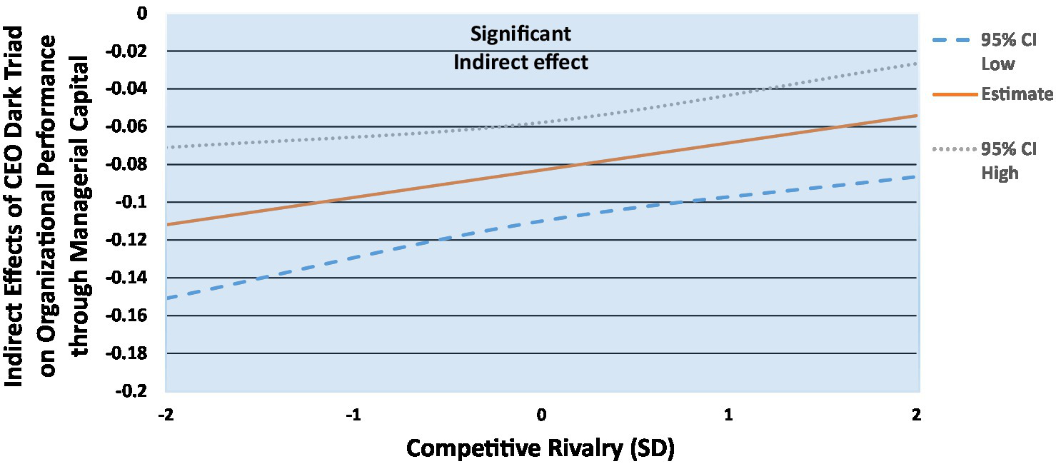 Beyond direct effects and two-way interactions, competitive rivalry is also explored as a boundary condition (Hayes, 2018), which represents an analytical strategy focused on “the contingent nature of processes, meaning whether “mediation is moderated”” (p. 2). Thus, the indirect effect of the CEO dark triad on performance indicators (via managerial capital as the mediator) will be dependent on the moderator (competitive rivalry). Here, we expect that the indirect effect of the CEO dark triad will become weaker as competitive pressures rise, with the influence of managerial capital becoming more important (Albertini and Berger-Remy, 2019). We posit the following: