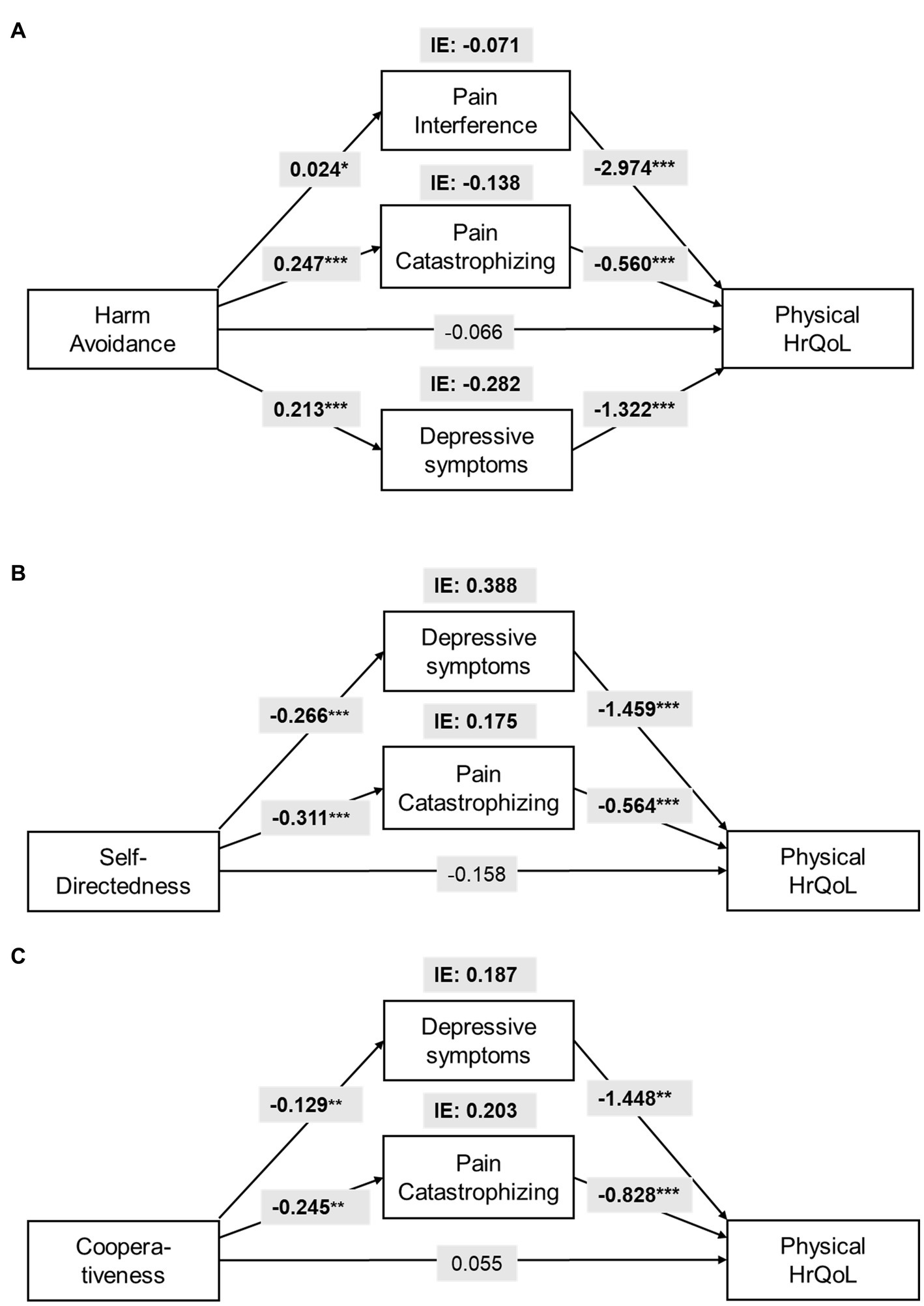 Figure 2. Parallel mediation model for the indirect effects (IE) of (A) harm avoidance (HA), (B) self-directedness (SD), and (C) cooperativeness (CO) on physical Health-related Quality of Life (HrQoL). All models are controlled for age and intensity of chronic pain. For statistical significance: *p < 0.05; **p < 0.01; ***p < 0.001.