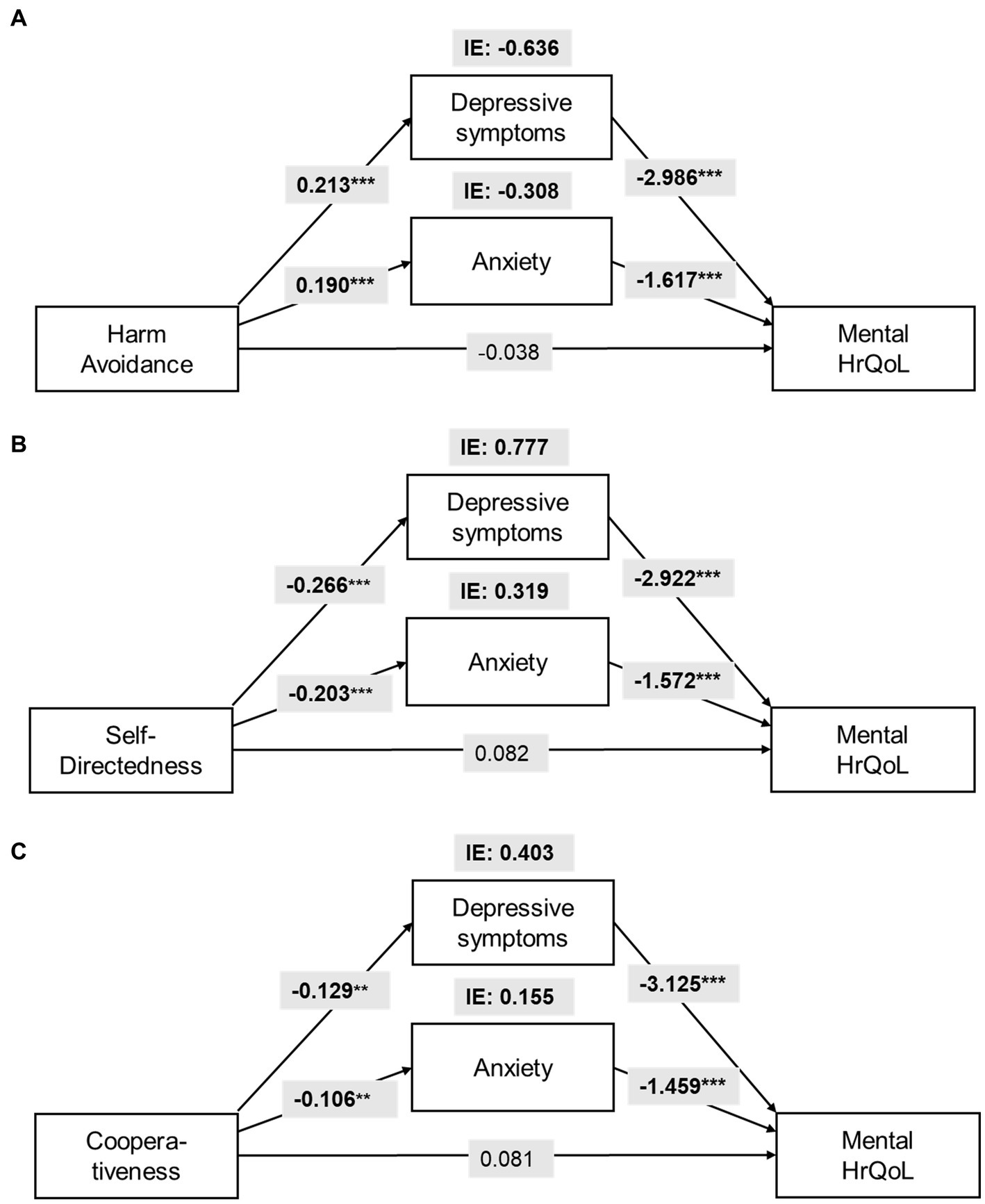 Figure 3. Parallel mediation model for the indirect effects (IE) of (A) harm avoidance (HA), (B) self-directedness (SD), and (C) cooperativeness (CO) on mental Health-related Quality of Life (HrQoL). All models are controlled for age and intensity of chronic pain. For statistical significance: **p < 0.01; ***p < 0.001.