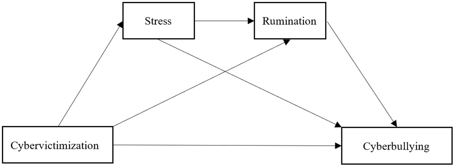 Hypothesis 3: Stress and rumination play a sequential mediating role in the relationship between cybervictimization and cyberbullying.