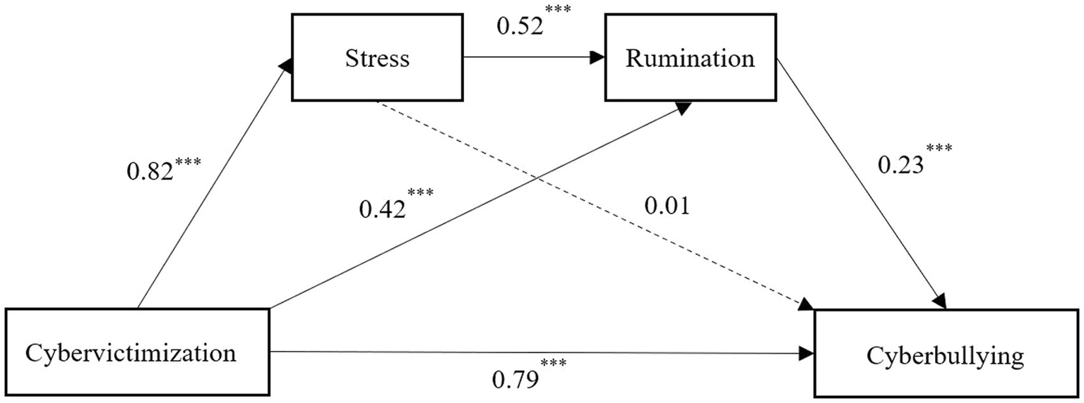 Table 2 presents the overall path coefficients of the mediation analysis. The results indicated that cybervictimization positively predicted stress (β = 0.82, p < 0.001), and there was a significant predictive effect of stress for rumination (β = 0.52, p < 0.001). Cybervictimization significantly predicted rumination (β = 0.42, p < 0.001), and cybervictimization positively predicted cyberbullying (β = 0.79, p < 0.001). Rumination significantly predicted cyberbullying (β = 0.23, p < 0.001); however, stress was not a significant predictor of cyberbullying (β = 0.01, p > 0.05).