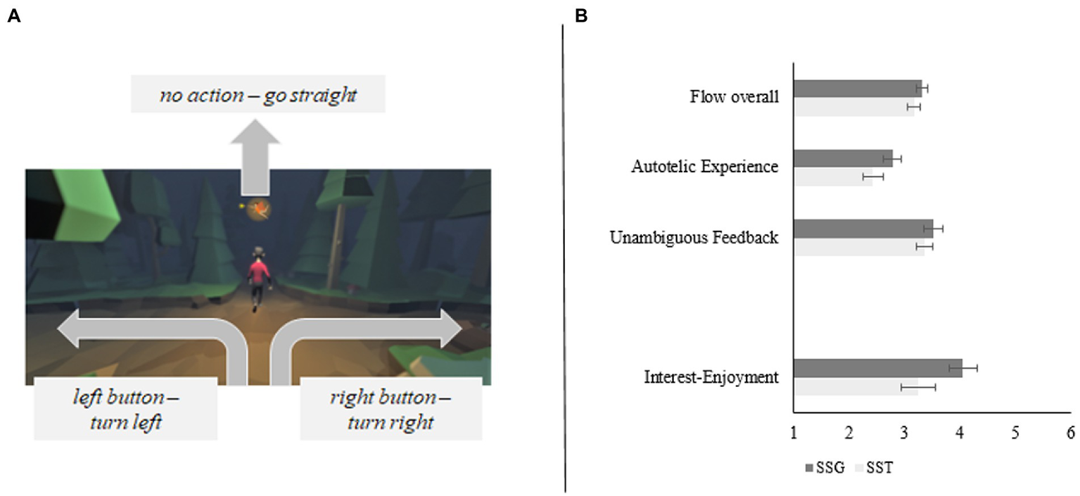(A) Visual representation of the gSST. A fairy points the way to the left or right. The middle of the screen shows the running avatar. (B) Subjective differences in experiences for SSG and SST. The game-version led to a more enjoyable experience. All displayed differences were significant with p < .05. Figure adapted from Friehs et al. (2020), JMIR:Serious Games.