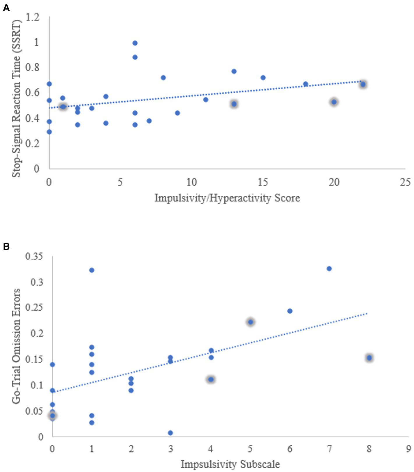 Scatter plots demonstrating (A). The relationship between impulsivity/hyperactivity and gSST performance (SSRT) (B). The relationship between impulsivity level and go-omission error rate.