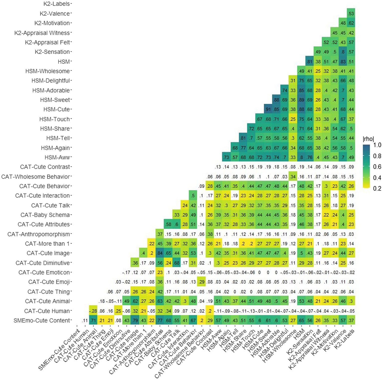 For the first research question, we explored the possible elements for characterizing cute stimuli and how those elements related to each other in the most parsimonious way. For the binary items indicating discrete cute content on the CAT measure, we calculated a sum score, representing the total number of cute attributes present in a post. We investigated how well this scale correlated with the six CAT items ranging 0–100 indicating continuous cute schemas, as well as the SMEmo-Cute Content to examine the convergent validity of this scale. We used Spearman rank-order correlations to calculate all correlations.