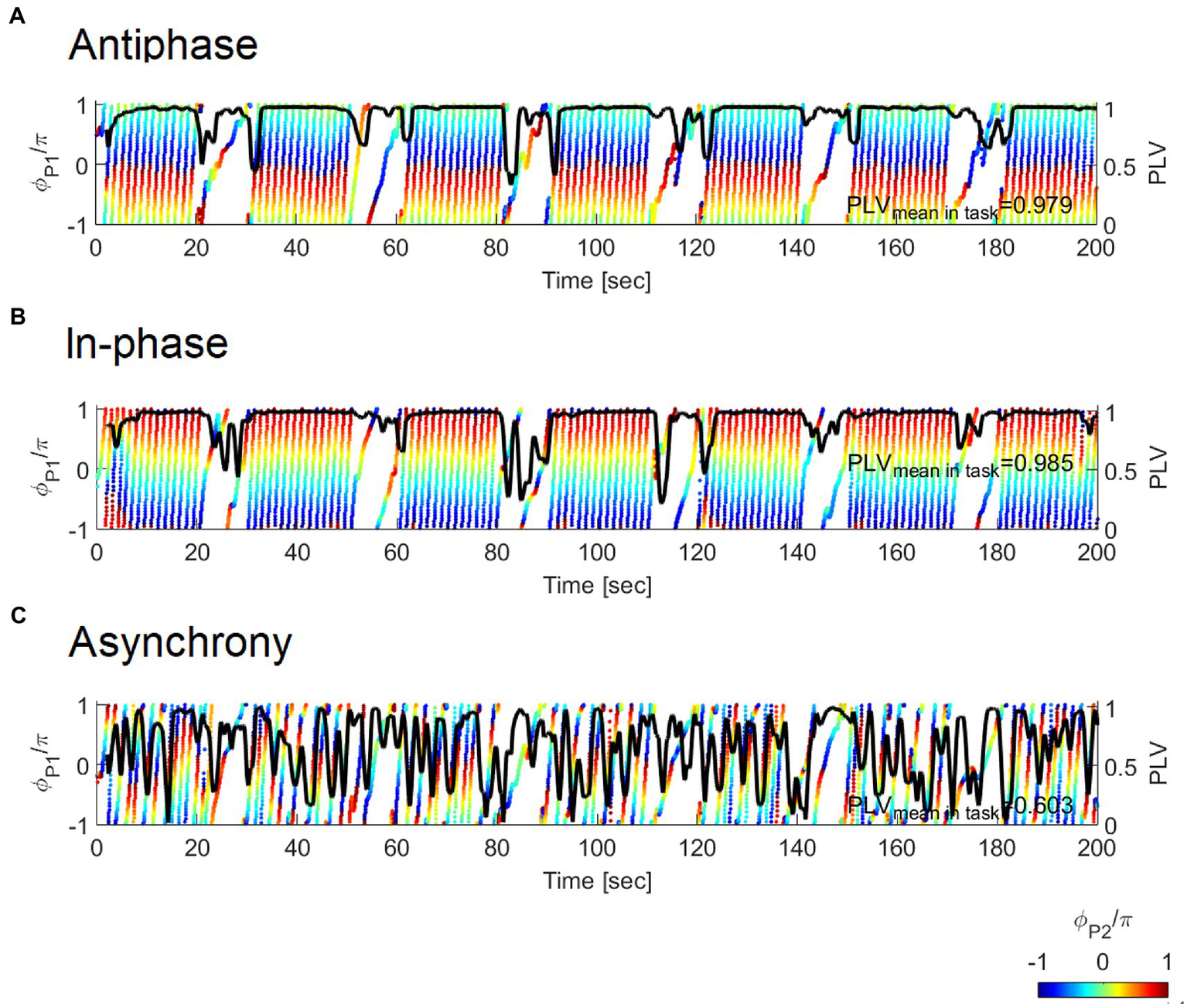 Example of the relative phase and PLV between the handclap motions of the participant (P1) and confederate (P2) in the (A) Antiphase, (B) In-phase, and (C) Asynchrony conditions. The color synchrogram illustrates a relative phase between the two types of participants. Colored dots represent the instantaneous phase of P1(). The diagonal arrays of dots in the plot demonstrate the increase of from −π to π. The color on dots shows the instantaneous phase of P2() as gains 2π from −π to π. Here −π, 0, and π are displayed in blue, green, and red, respectively. Phase synchronization is represented by horizontal lines of the same color band. PLV, indicated by the thick black line, is stable with a high value across trials in both the antiphase and in-phase synchrony conditions but unstable in the asynchrony condition.
