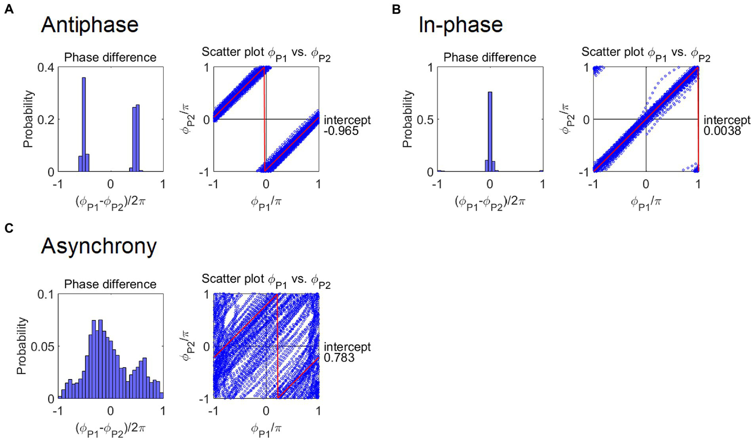 Example of a distribution (Left) and a scatter plot (Right) of the phase difference between the handclap motions of the participant (P1) and confederate (P2) in (A) Antiphase, (B) In-phase, and (C) Asynchrony conditions. The distribution of the antiphase condition presented a bimodal peak around −π and π, whereas that in the in-phase condition showed a sharp peak around zero. In the asynchrony condition, the distribution shape was unspecified. In the scatter plot of the phase difference, red lines represent the regression lines fitted with the sawtooth wave function The intercept in the plot, f(0), represents the phase difference.