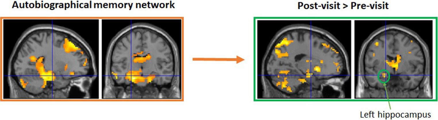 Groups in Maynooth, Swords, Tallaght, and Dublin city center all took part in 6 weeks of reminiscence. Weekly groups recalled stories on their earlier years about personal experiences and major national events, with the help of photos, such as the visit of John F Kennedy in 1963 and the Pope in 1979. While only modest improvements were observed in these groups, this is likely due to the fact that they were a cognitively very healthy group at the outset and the fact that numbers were low in each group, reducing statistical power (Allen et al., 2020, 2021a). To examine potential benefits for cognitive decline, a modified version of this intervention was administered to a small group of older adults living with dementia, with a weekly group meeting in Peamount Healthcare’s Dementia Unit. Again, measures of cognition and psychological health were taken before and after 6 weeks of reminiscence, with some indications of improvements in certain aspects of memory (Allen et al., 2021b). An additional patient experiencing Transient Epileptic Amnesia (TEA) also participated in the intervention, and again some modest improvements were observed. Functional imaging data are currently being analyzed (Viard et al., in preparation). The classical autobiographical memory network (including the precuneus, medial frontal and lateral temporal gyri, and hippocampi) was activated for pre- and post-visits separately. Direct comparisons showed greater activation for post-visit in left superior medial frontal gyrus, precuneus, and anterior hippocampus, compared to pre-visit (see Figure 1).