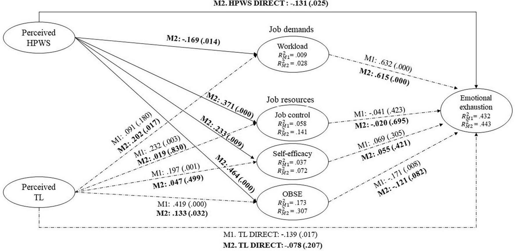 | M2 | TL → job control → emotional exhaustion | 0.000 (0.997) |