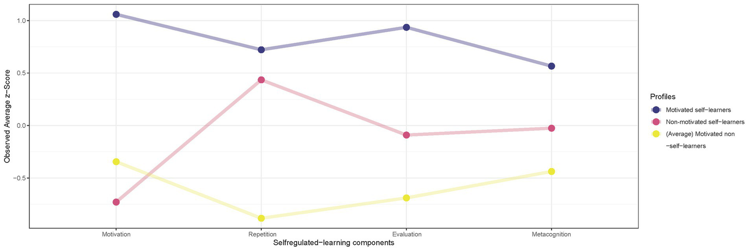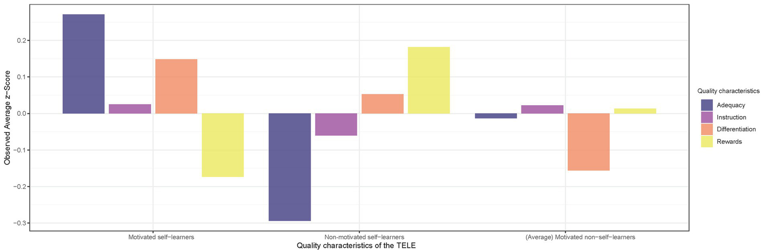 We then analyzed the descriptive quantitative data, such as reliability statistics, average expression, and correlation of the items within and between the two test instruments. For these analyses, we used the R package psych (Vers. 2.2.5; Revelle, 2022). To answer RQ1 on the students’ SRL profiles, we z-standardized the data and performed a cluster analysis with the most important SRL strategies (evaluation, control, and repetition; Section 2.2.1), metacognition and motivation. Thus, we first used a hierarchical clustering procedure followed by identifying artificial cases and deleting them from the dataset using the nearest neighbor method and a dendrogram. By subsequently applying the Ward method, using the elbow criterion and the dendrogram, we determined the number of clusters that best fitted the data. The result was a three-cluster solution determined through a K-means cluster analysis. To answer RQ2 on the influence of the SRL profiles on the students’ rating on the TELE, we conducted a comparative analysis of the mean z-scores for the different quality characteristics (adequacy, instructions, differentiation, and rewards) for each SRL profile using the Kruskal–Wallis test.