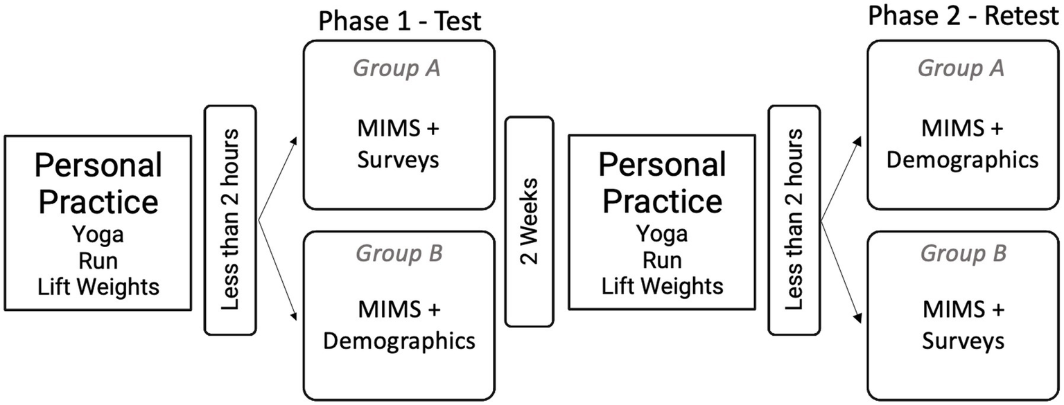 Recruitment occurred through social media posts, online posts hosted through the university, and flyers hung around campus. Direct emails were also sent to related places of business (e.g., gyms and yoga studios). After passing a screening questionnaire, participants were randomized into Group A (received MIMS + surveys for validation at test, and MIMS + demographics at retest) or Group B (received MIMS + demographics at test, and MIMS + surveys for validation at retest; Figure 2). The random division into two groups served to minimize any effect the surveys had on responses to MIMS. Participants completed their usual movement practice, and within 2 h completed their initial test/survey. We chose this 2-h period as the acute effects of exercise are most potent up to 2 h after exercise cessation (Basso et al., 2015). After a 2-week wash-out period, participants were instructed to complete their typical workout again and then complete their retest within 2 h. Participants were instructed that this 2nd workout should be as close to the initial as possible in terms of type of activity, length and intensity of workout, and time of day completed. Participants were compensated $20 for completing the entire study with no partial payments.