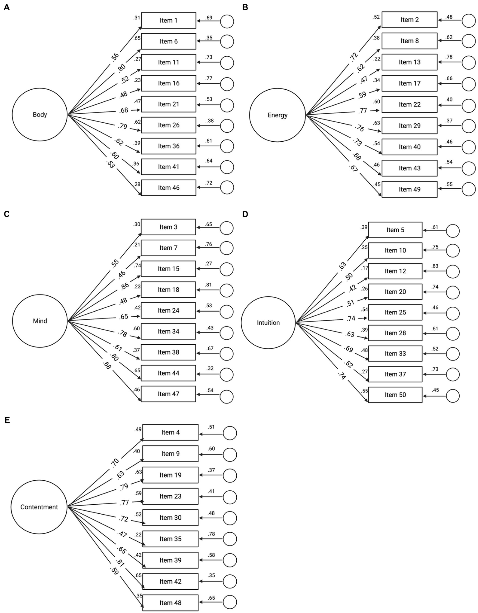 MIMS demonstrated test–retest reliability of r = 0.737 with significance of p < 0.001. All subscales showed significant stability over time, with r > 0.670, p < 0.001 or higher for each subscale. Internal consistency was confirmed with Cronbach’s alpha for each factor and individual question. There were nine questions in each of the five a priori factors, which were all examined individually. All questions remained, showing that a removal of any question would not result in a change in Cronbach’s alpha below 0.700. Cronbach’s alpha is between 0.775 and 0.840 for each of the factors (body α = 0.781, energy α = 0.840, mind α = 0.815, intuition α = 0.775, and contentment α = 0.830).