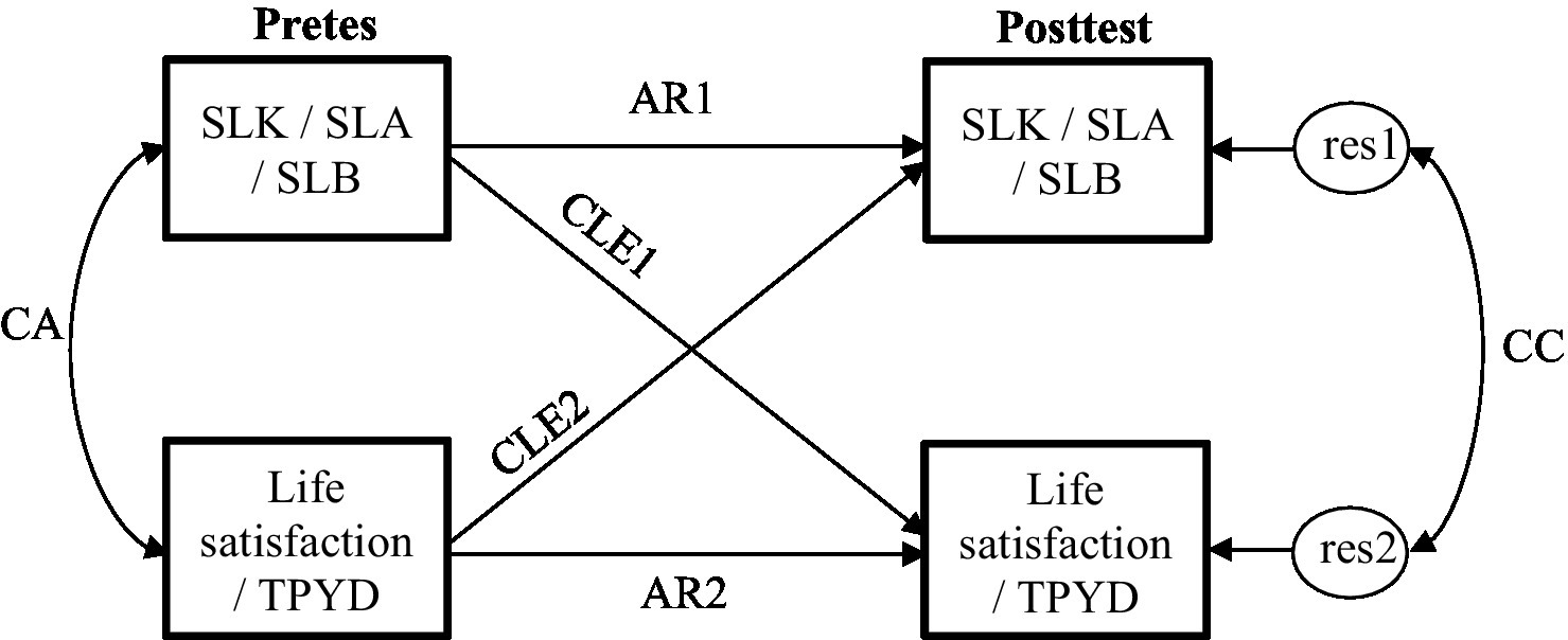 Cross-lagged path analyses of the relationships between service leadership attributes and well-being indicators. SLK, service leadership knowledge; SLA, service leadership attitude; SLB, service leadership behavior; TPYD, total positive youth development score; res, residual; CA, concurrent association; AR1, autoregression of service leadership attributes; AR2, autoregression of well-being indicator; CLE1, cross-lagged effect of service leadership attributes on well-being indicator; CLE2, cross-lagged effect of well-being indicator on service leadership attributes; and CC, correlated change.