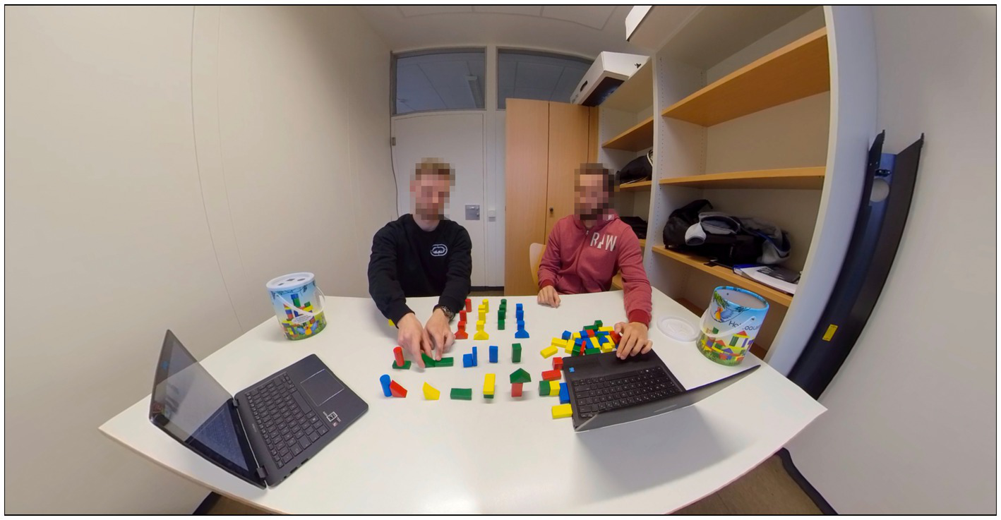 In the learning session, participants in all conditions received the same information about the rules. The video material used in the VR and 2D conditions was recorded with the Insta360Pro 3D/360° camera with a resolution of 4 k (3840 × 2160 pixels). The video was stitched with the Insta360Stitcher,1 resulting in the same video in 3D/360° for the VR condition and in 2D for the video condition (see Figure 2). In the VR condition, the video was presented with the HTC VIVE Cosmos (with a resolution of 1440 × 1700 pixels per eye), and the 2D video was presented on a conventional screen (17″, resolution of 1920 × 1080 pixels). In the videos, the rules for the arrangement of the building blocks were demonstrated by two instructors. They briefly presented the different shapes and colors of the building blocks and explained each rule while arranging the building blocks according to the respective rule. All rules were presented a second time, resulting in a video length of 5 mins. The same wording as in the video was used for the instructions in the text condition, which were additionally illustrated with pictures. According to the video length, participants in the text condition had 5 mins to learn the rules. Apart from the respective stimulus material, no additional learning material was provided to any of the participants and no instructions for applying specific learning methods were given.