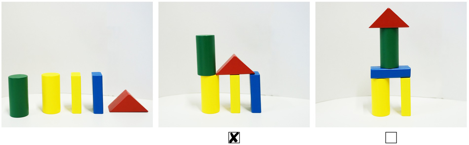 After the learning session, each participant performed a recognition test consisting of a multiple-choice questionnaire (MCQ) and a construction test (CT). Each test only contained one of the two rule sets, requiring participants to complete either the MCQ based on rule set A and the CT based on rule set B or vice versa. The MCQ and CT each consisted of eight tasks containing all rules of the respective set. Some tasks required a combination of rules to be applied, while others only involved particular rules. Each task of the MCQ consisted of three pictures: The first picture showed five building blocks, and the other two pictures either presented a wrong or a correct arrangement of the building blocks. The picture showing the correct arrangement according to the rules had to be marked (see Figure 3). In the CT, five different building blocks had to be arranged according to a particular rule or a combination of rules (see Figure 4). The order in which the two tests had to be completed was randomized over all participants.