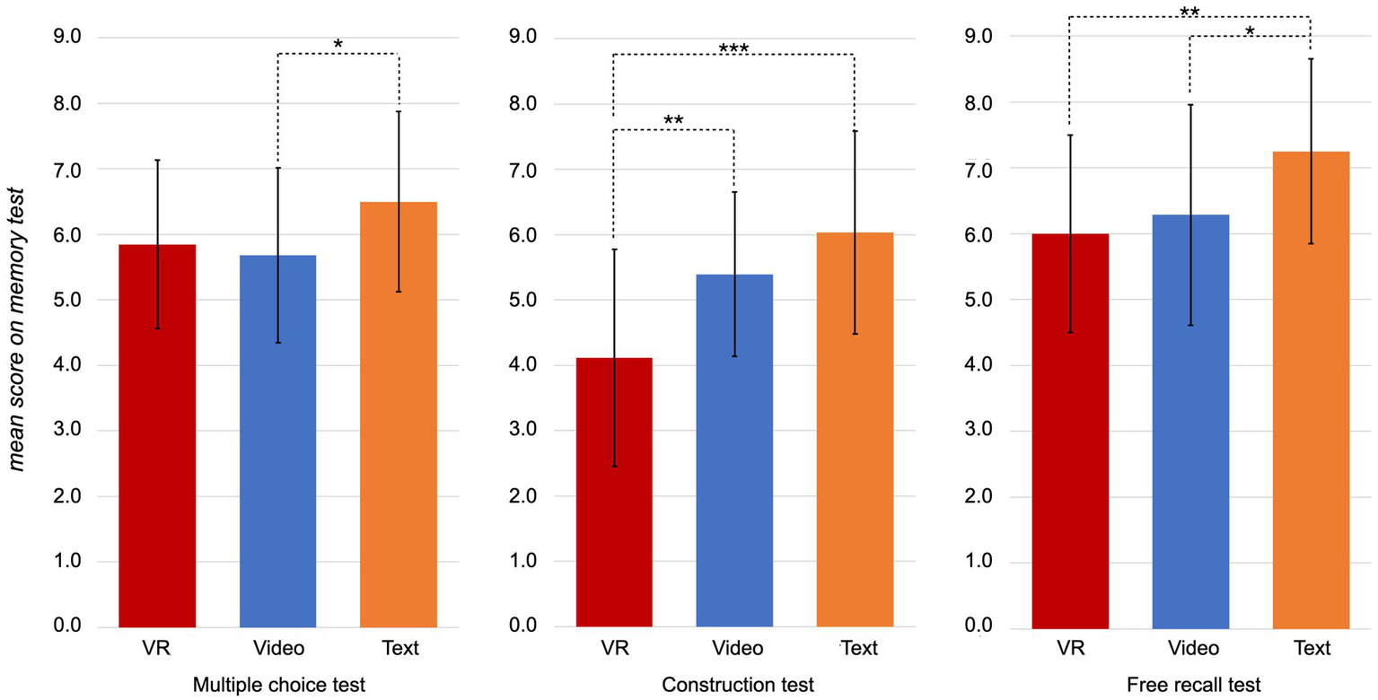The present study aimed to further clarify under which conditions the use of VR can enhance mnemonic processing by comparing memory performance after learning information about the spatial arrangement of building blocks in VR, with a 2D video or a written text. Contrary to our expectations, the text condition provided the best overall results regarding memory performance, outperforming the VR condition in both the CT and the FR and the video condition in the MCQ and the FR. Additionally, the video condition outperformed the VR condition in the CT, whereas no superiority effect of the VR condition was observed at all.