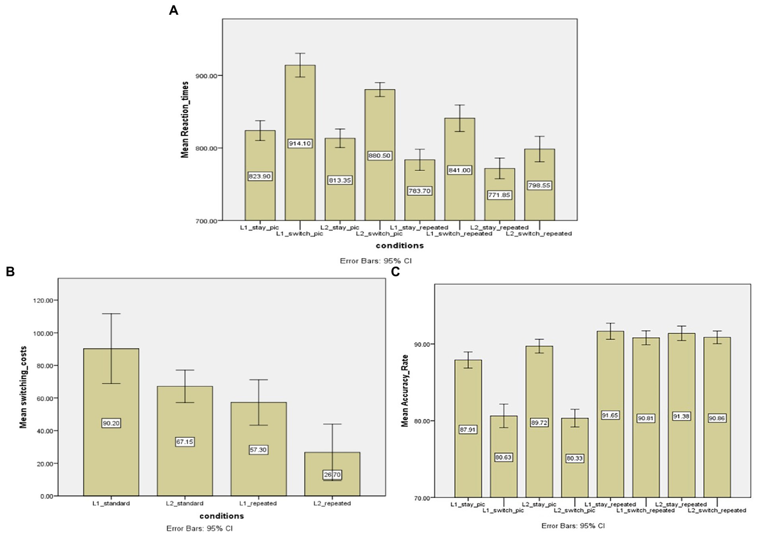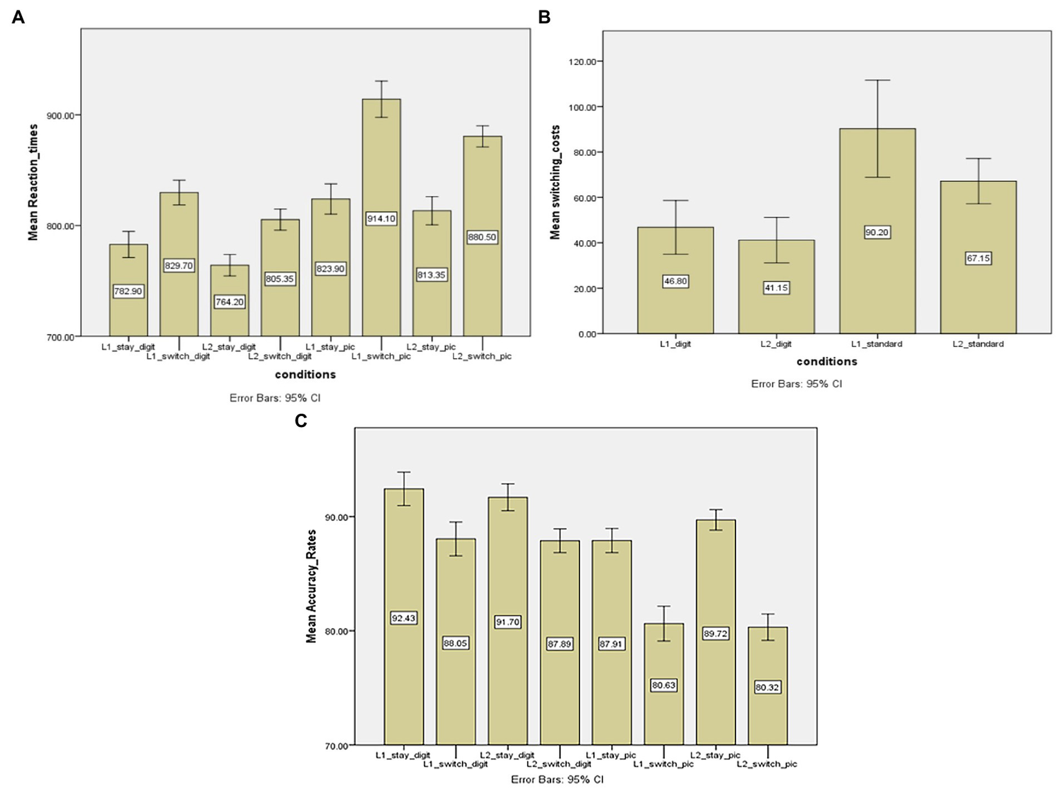 It should be noted that switching costs are mainly calculated by the reaction time difference but not the accuracy (or error) rate between stay and switch trials in previous language and task switching studies. This is because accuracy rates were either very high (e.g., Guo et al., 2011) or insensitive to switching costs (e.g., Meuter and Allport, 1999; Costa and Santesteban, 2004). Therefore, this study will follow this trend: the analysis of the accuracy rate data were reported but switching costs were only measured by the naming latency difference between stay and switch trials.