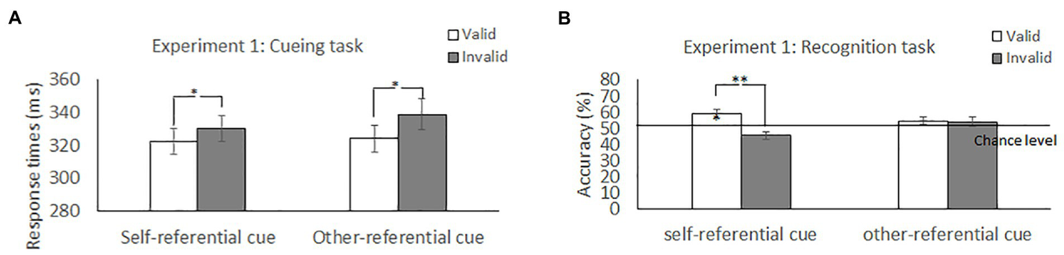Mean difference in response times in the cueing task and accuracy in the recognition task to self-and other-referential arrow cues in Experiment 1. **p < 0.01; *p < 0.05.