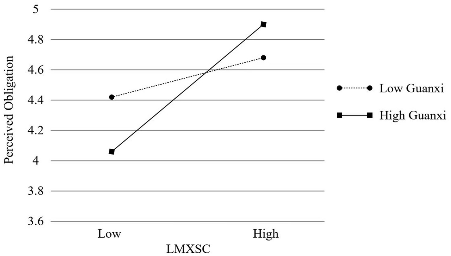 As stated earlier, LMXSC instills in employees a feeling of obligation towards the leader. In this section, we investigate which situations LMXSC will have a greater or lesser effect on perceived obligation using the social exchange perspective. In particular, we argue that guanxi makes the link between LMXSC and perceived obligations stronger. Guanxi is the core concept for comprehending Chinese social structure and interpersonal interaction among Chinese, who are primarily relationship-oriented (Chen and Chen, 2004). That is, guanxi is widespread and all-encompassing in Chinese society and is seen as a major factor in influencing how Chinese interact with and treat others (Wang et al., 2005). The concept of guanxi originates from Confucianism, which has identified the five most fundamental relationships between people: monarch, father and son, couple, brother, and friend (Haibo, 2020), namely the “five lun.” Five lun desires that all parties in a particular relationship express and behave in accordance with their social roles. In Chinese companies, supervisor-subordinate guanxi is an informal and personal relationship characterized by personal contact, emotional engagement, and mutual support beyond the workplace (Zhang et al., 2016). Guanxi develops mostly via non-work-related social contacts, such as having dinner, giving gifts, and helping, and emphasizes the principle of communal sharing between parties (i.e., the development of significant personal obligations based on specific or emotional ties; Zhang et al., 2015). In contrast, LMX originates from work-related interactions that are confined to the workplace, include only work-related exchanges, and emphasize the equity-matching principle (i.e., the fair exchange between performance and rewards for leaders and employees; Martin et al., 2005). We argue that there are three reasons to explain why guanxi may be a potential moderator in the relationship between LMXSC and perceived obligation.