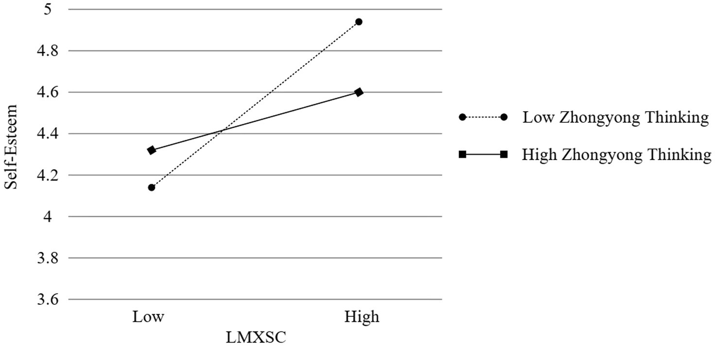 Zhongyong thinking influences how employees view and respond to LMXSC. First, employees with high Zhongyong thinking tend to be more perspective-taking and see the world from others’ viewpoints (Wei and Wang, 2020). In this case, high-level LMXSC members who make downward comparisons may consider and share the thoughts and sensations of their less fortunate coworkers, thereby weakening their sense of relative superiority (Yu and Yang, 2022). Second, employees with Zhongyong thinking might analyze LMXSC from a long-term vantage point (Chou et al., 2014), indicating that they are less prone to be misled by the relatively high LMX standing at present. In fact, the present high LMXSC is not fixed in stone, and the current high LMXSC does not guarantee that it will be maintained in the future. When employees with Zhongyong thinking are able to recognize this point, the benefits associated with having a high LMXSC in the social comparison process are diminished for those employees. As a result, possessing a high LMXSC ranking could no longer serve as a motivating factor for those employees to develop their self-esteem. Conversely, when low LMXSC members with high Zhongyong thinking engage in upward comparisons, they may put themselves in the shoes of better-off coworkers and think that their status level (i.e., high LMXSC) is attainable for them in the future (Buunk and Ybema, 1997). Third, the connotation of integration in Zhongyong thinking motivates employees to develop cooperative beliefs rather than competitive beliefs (He and Li, 2021). A competitive belief makes employees more likely to feel alienated from the team, leading them to care more about the outcomes of social comparison, thereby highlighting the effects of LMXSC (Garcia et al., 2013). That is, competitive belief emphasizes the contrast effects of social comparison, making LMXSC more important in the process of developing individual self-esteem (Morse and Gergen, 1970). Cooperative mindset causes employees to diminish the disparities between themselves and their low LMXSC coworkers and to view their superior ranks in terms of LMXs as common and reachable by their coworkers, thereby lowering their self-esteem (Buunk et al., 1990). Finally, Zhongyong thinking personnel would understand that an excess of any good thing is ultimately undesirable (Pierce and Aguinis, 2013). Zhongyong thinking highlights universal advocacy for proportionality over extremity (Wei et al., 2020). In such a context, low LMXSC members with high Zhongyong thinking might perceive the current low LMXSC as no bad thing, while high LMXSC members with high Zhongyong thinking might perceive the current high LMXSC as no good thing. Thus, the positive effect of LMXSC on self-esteem is diminished by Zhongyong thinking. Overall, we propose our hypothesis: