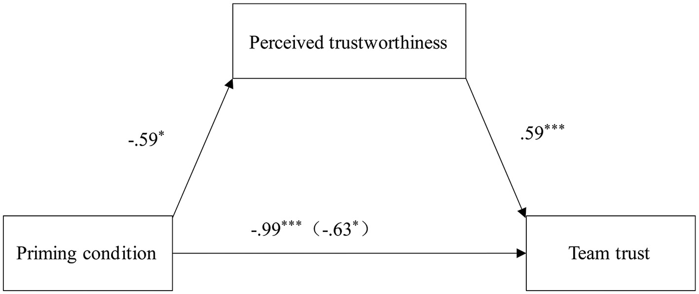 Adopting Hayes (2017) method, a mediation analysis (Model 4 in Process macro) with a bootstrapping method (5,000 samples) was performed. The total effect of the priming condition on team trust was β = −0.99 [95% CI = (−1.64, −0.33)]. However, when the mediator was added to the analysis, the direct effect of the priming condition dropped to β = −0.63 [95% CI = (−1.19, −0.59)]. Meanwhile, the priming condition had a statistically significant effect on perceived trustworthiness [β = −0.59, 95% CI = (−1.16, −0.03)], perceived trustworthiness also had a significant effect on team trust [β = 0.59, 95% CI = (0.43, 0.77)], and perceived trustworthiness was found to have a significant mediating effect between priming condition and team trust [β = −0.35, 95% CI = (−0.72, −0.02)]. The relationship is depicted in Figure 2.
