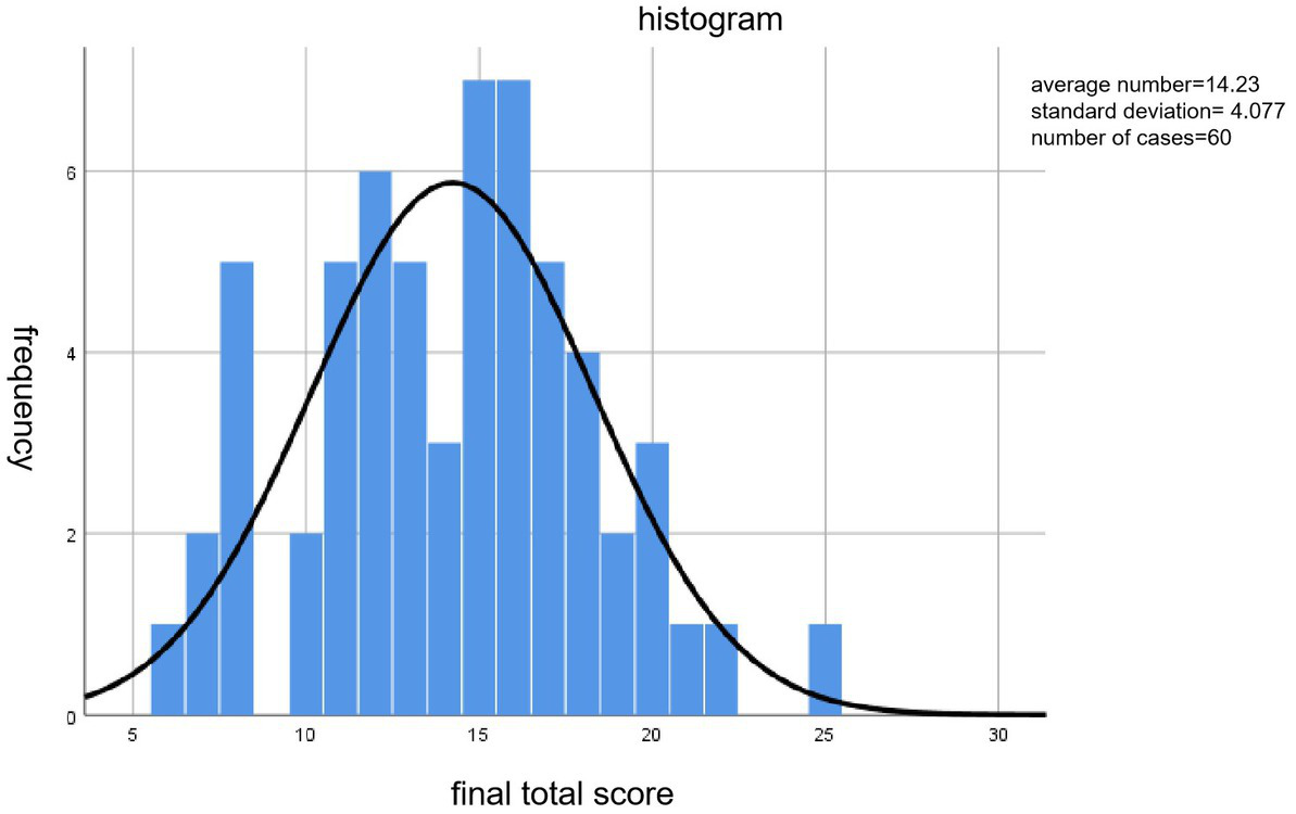 According to the total score of the 60 5–6-year-old children’s reading abilities, the test participants’ scores ranged from 6 to 25. The reading abilities of most children were at the intermediate level since most of the children scored 15–16, while only a few had low scores and one scored full points. That is to say, their reading abilities still have large room to grow. Besides, the approximately normal distribution with 0.309 skewness and 0.194 kurtosis shows that the tools used here to test the children’s early reading abilities are reasonable (Table 2).