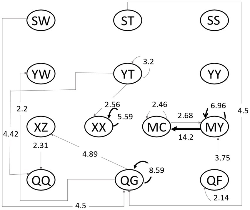For further analysis of participants’ reading-response modes, all reading-response codes were input into GESQ5.1 to generate a residual plot. If Z > 1.96, this behavioral sequence is regarded as reaching the significant level. Then we transfer the residual plot into a behavioral sequence diagram, as shown in Figure 2. The arrow shows the direction of the significant sequence, the number represents the value of Z, and width of the lines shows the level of action-sequence significance.