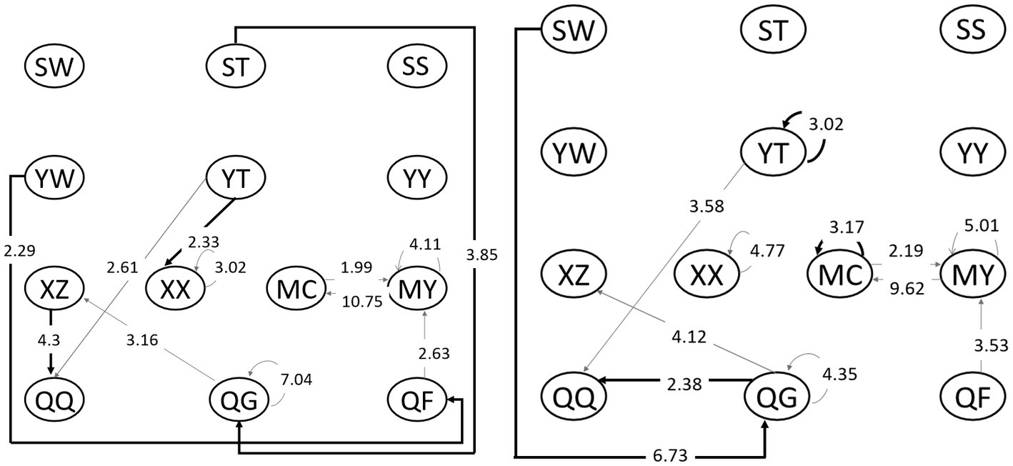 Behavioral sequence diagram. High reading-ability group (left); Low reading-ability group (right). SW, watching words; ST, watching pictures; SS, watching peritext; XA, identifying and cognizing; XX, role playing; YW, word description; YT, picture description; YY, relevance description; QQ, emotion expression; QG, personal-experience response; QF, analysis and evaluation; MC, creative expression; and MY, artistic response.