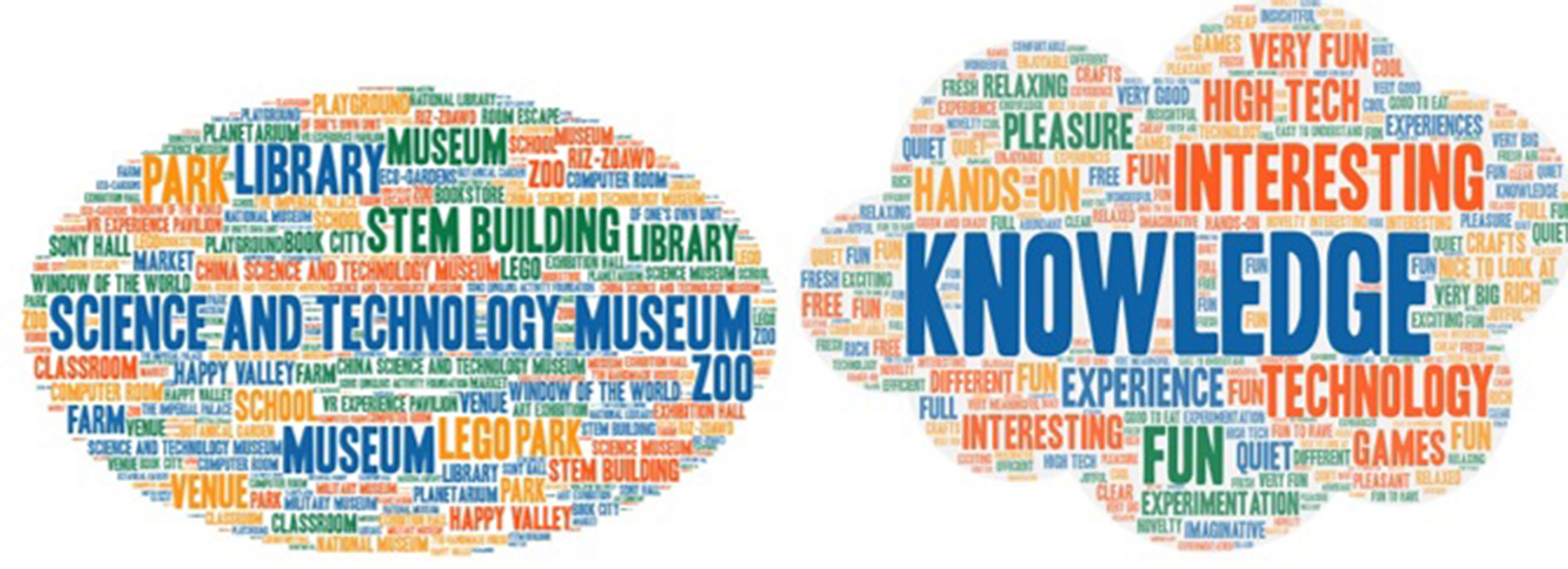 We also designed an open question to invite the children to provide examples of LtP spaces that they often visited and explain why. We extracted keywords from the resulting data and imported them into an online micro-word cloud platform (https://www.weiciyun.com/) to generate a word-cloud map, as shown in Figure 2. We found that, although the children liked outdoor spaces the most, they frequently went to public indoor venues, such as science and technology halls, museums, and libraries. When they explained why, “knowledge” was found to be their main consideration, followed by “fun.”