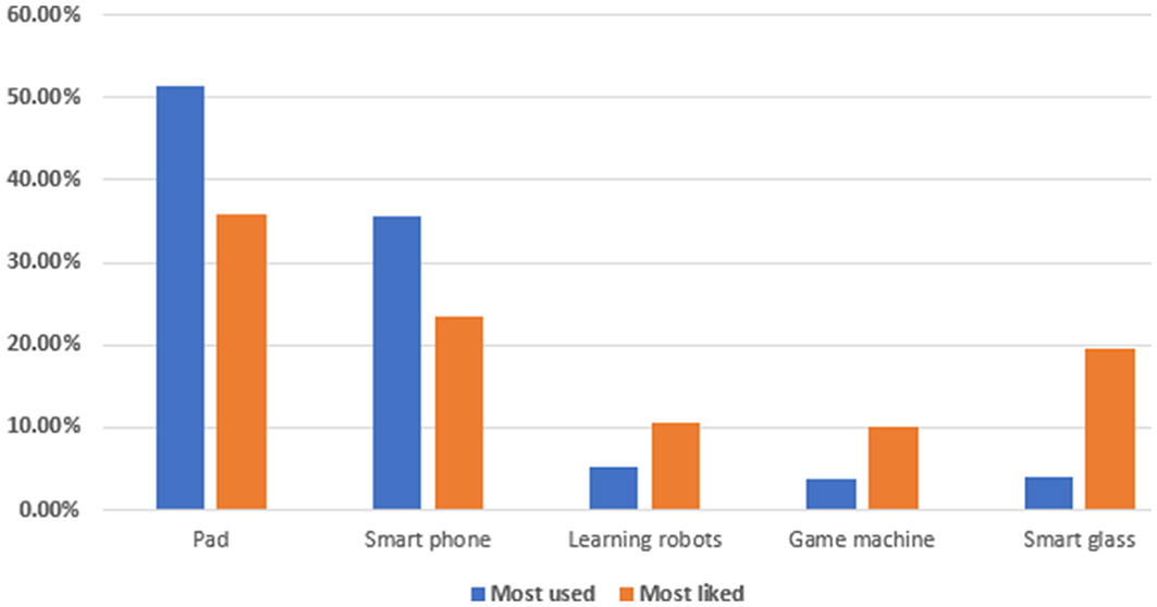 Regarding the devices and tools used, nearly all children reported that they could access at least one device for LtP. These devices and tools are shown in Figure 3. The tablet was the most used and most liked device, followed by the smartphone. Although learning robots and smart body equipment (e.g., smart glasses and gamepads) are increasingly common, they are not yet popular with families and thus will not be useful for children's LtP for some time.
