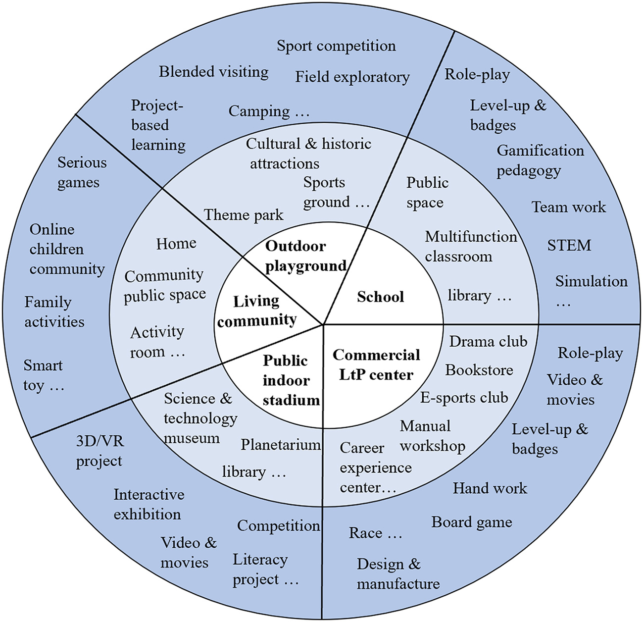 Our pilot study revealed a more complex structure for the LtP-based multimodal learning environment. As Figure 4 shows, we developed an LtP-based multi-modal learning system that breaks up the monotonous environment of the traditional classroom. As Arnott and Yelland (2021) explained, playful activities can connect children with each other and act as a catalyst for extending visual, aural, spatial, gestural, and linguistic learning modes. The participants' opinions in this study were based on their LtP learning experiences. LtP encompasses various types of formal and informal learning, and LtP projects are typically designed through elements such as game prototypes. These can be fun and interactive, such as role-playing games, action games, virtual manipulation, adventure games, strategy games, battle games, shooting, puzzle games, rewards and leaderboards, card games, sports competitions, music games, social communities, and handicrafts work (Kapp, 2012). Figure 8 shows the broad structure of the LtP environment, in which the inner circle comprises five types of LtP spaces, the second circle comprises LtP places, and the outermost circle comprises LtP activities.