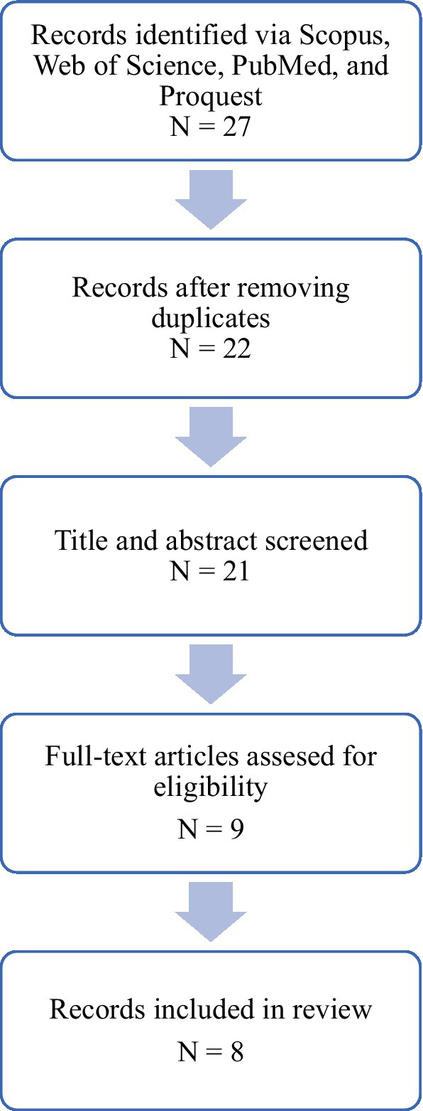 In the selected databases, 27 articles were identified, out of which 6 were removed automatically because of 5 duplicates and 1 article written in Hungarian. Next, we screened the articles in terms of the type of article, and another 7 articles were removed. We then assessed the articles for their eligibility given the criteria stated above, which resulted in the inclusion of 8 studies in the review.